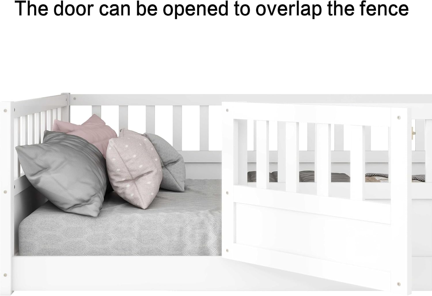 We are dedicated to provide the highest quality, the most comfortable and best user experience products. Description Overall structure of fence 1.The overall structure of the middle fence is not truncated, and the floor fence bed is more stable, 2.improving the safety of children's play and the durability of the product Design the door clockwise Support slat 1.Clockwise door opening design, easy to open the door, easy for children to enter and exit safely, 2.The door opens to overlap with the fence, improving practicality and aesthetics 3.The support slats better increase the stability of the fenced bed and the protection of the mattress High fence baffle design 1.The 21.45-inch high fence is suitable for mattresses of various thicknesses to improve the safety of children's activities. 2. Solid wood baffle design, to prevent children's hands and feet to clamp the risk of toys and various items falling risk Specifications Total dimensions:78.19x56.97x21.46"(L*W*H) Product weight:61.73lbs Material:Wood Mattress NOT INCLUDE Package 1 Size:80.31x15.94x6.69” Weight:66.14lbs