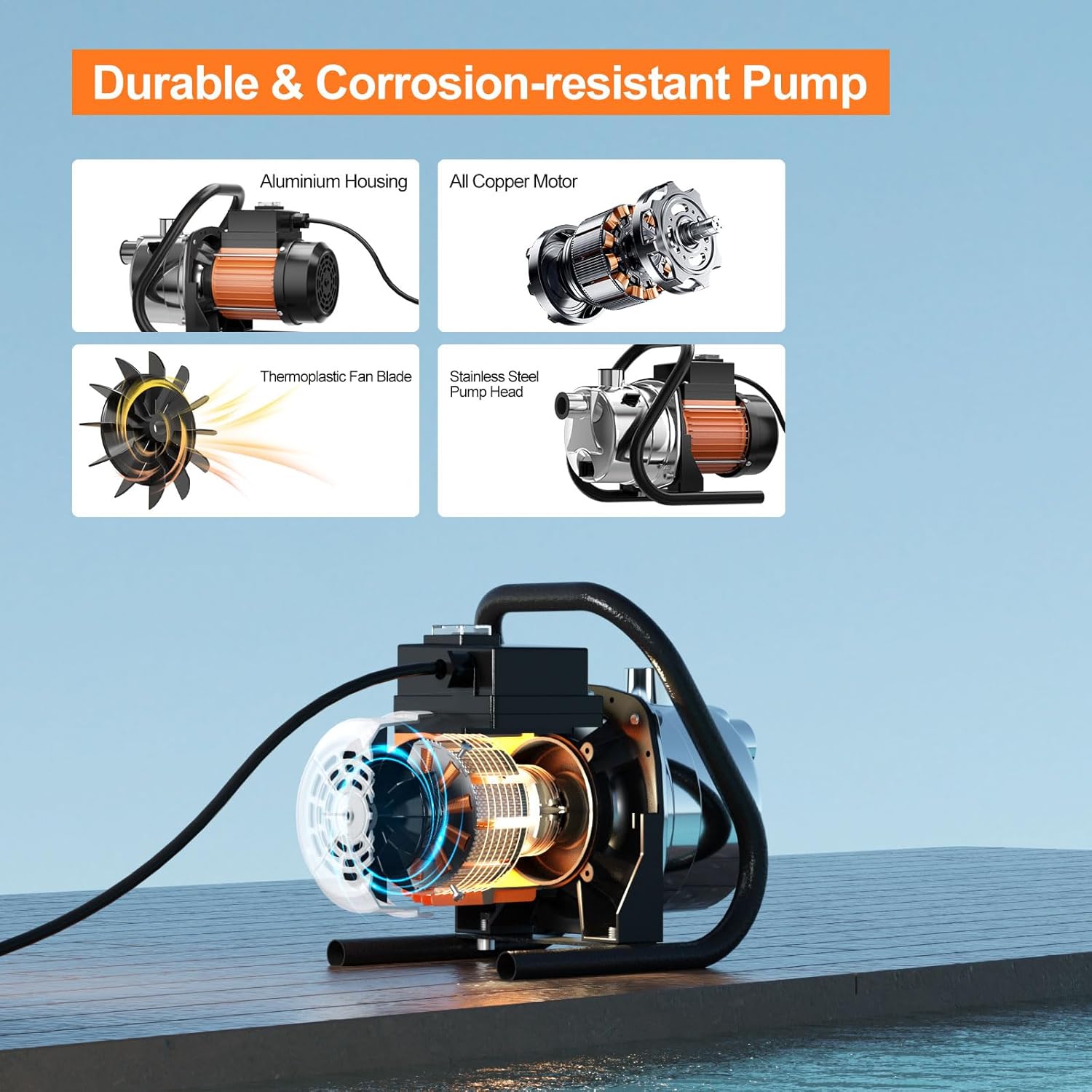 The SHANGDA electric water transfer pump is featured with a hollow handle design, which is easy to carry. Corrosion-resistant stainless steel construction is durable and stable. Max 65 PSI water pressure output makes this shallow jet well pump perfect for irrigating or water transfer.