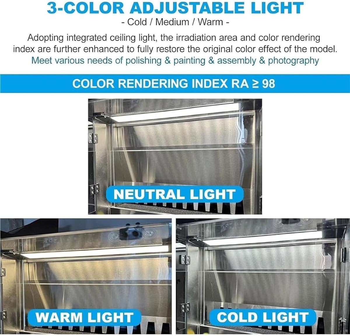 Our booth combines powerful 1480 m³/h filtration with hands-free gesture control, allowing you to focus purely on your art. Achieve flawless finishes on models, automotive parts, and custom designs in a clean, safe environment. The tool your workspace has been missing.Features:Efficient Dual Filtration System – Instantly captures overspray and fumes with a water curtain and high-power fan for cleaner air.Smart Gesture & Touch Control – Operate easily with a hand wave or touch, perfect for messy projects.Automatic Self-Cleaning Pump – Lifts automatically to prevent clogging; makes water changes quick and contact-free.Specification:Name: Water Curtain Airbrush Spray BoothColor: SliverPower: 180WHigh Speed: 1480m³/hLow Speed: 1280m³/hEquipment Noise: 56dBWater Curtain Flow: 2200L/HLighting: ≥48W 6000K Ra≥98Product Size: 50×36×45cm/19.68×14.17×17.71inWeight: 17kg/37.48lbsPackage Includes:1 × Portable Hobby Airbrush Spray BoothNotes:1. Please allow the slight color difference caused by the shooting light and 1-3cm error due to manual measurement.2. If you have any questions please contact me and I will reply you within 24 hours