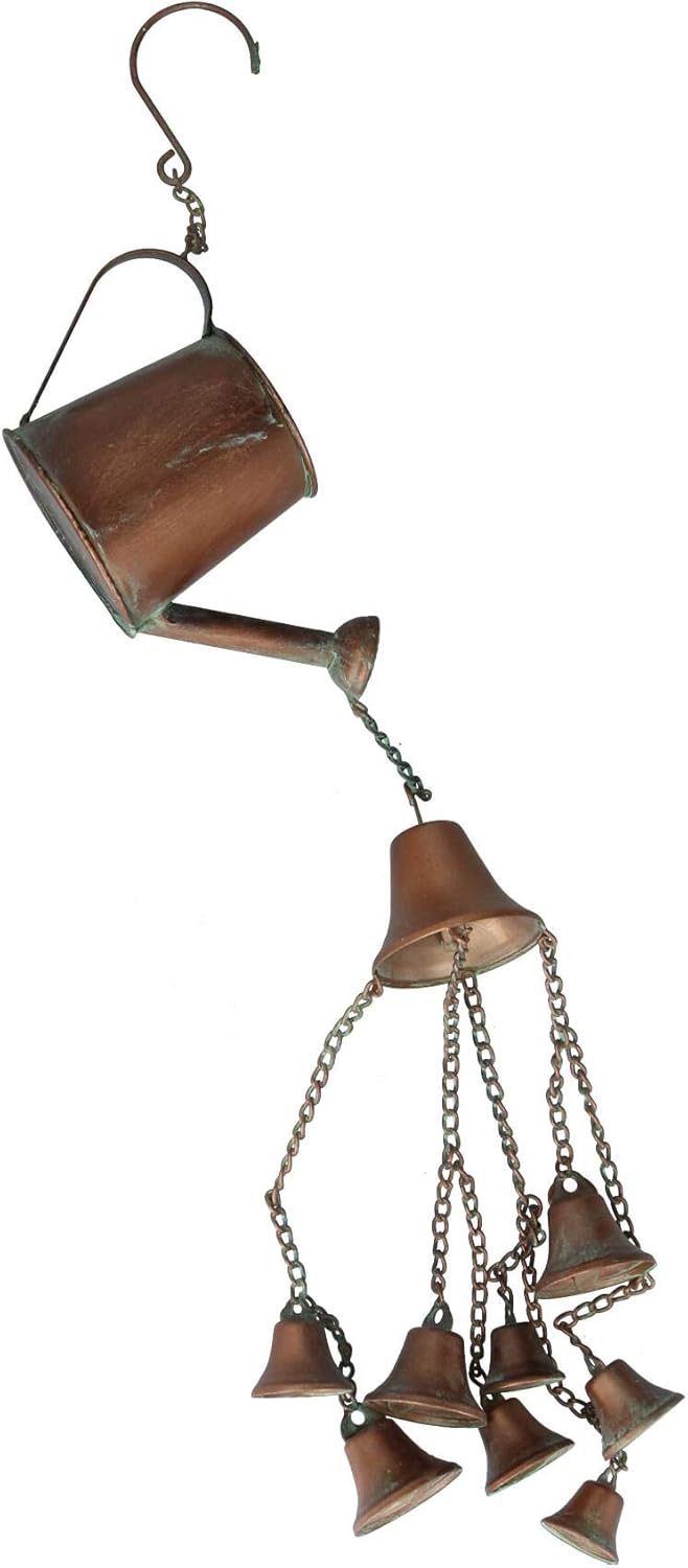 Metal garden outdoor hanging watering can shaped wind chime. Beautiful design of a wind chime with 9 bell designs. Designed to look as if the watering can is pouring. 75cm long approx. Watering can size: 8.5cm x 17cm. Perfect for gardens, porches, windows, doors etc... Colour: Antique Blue.This item is NEW, but comes in "Rustic" condition and is being sold as pictured.
