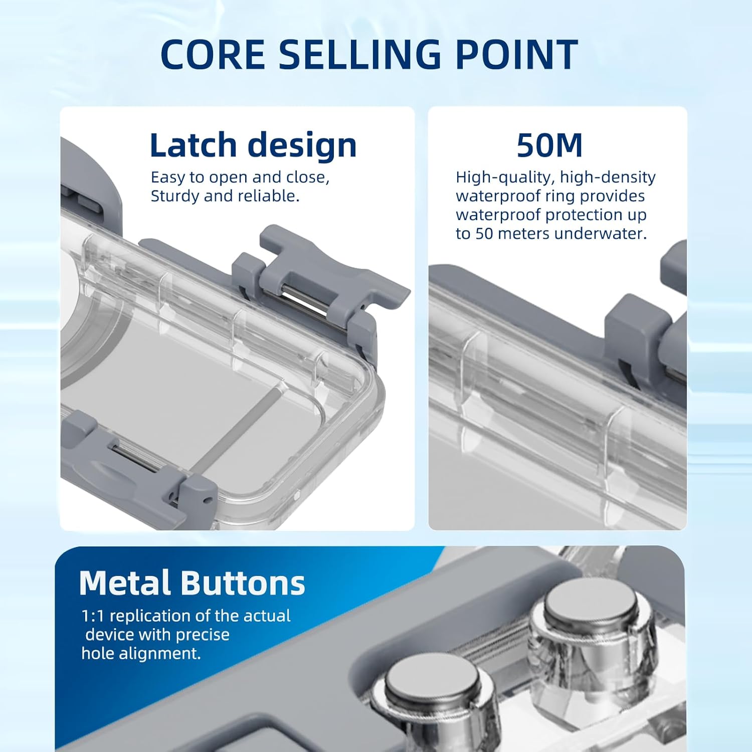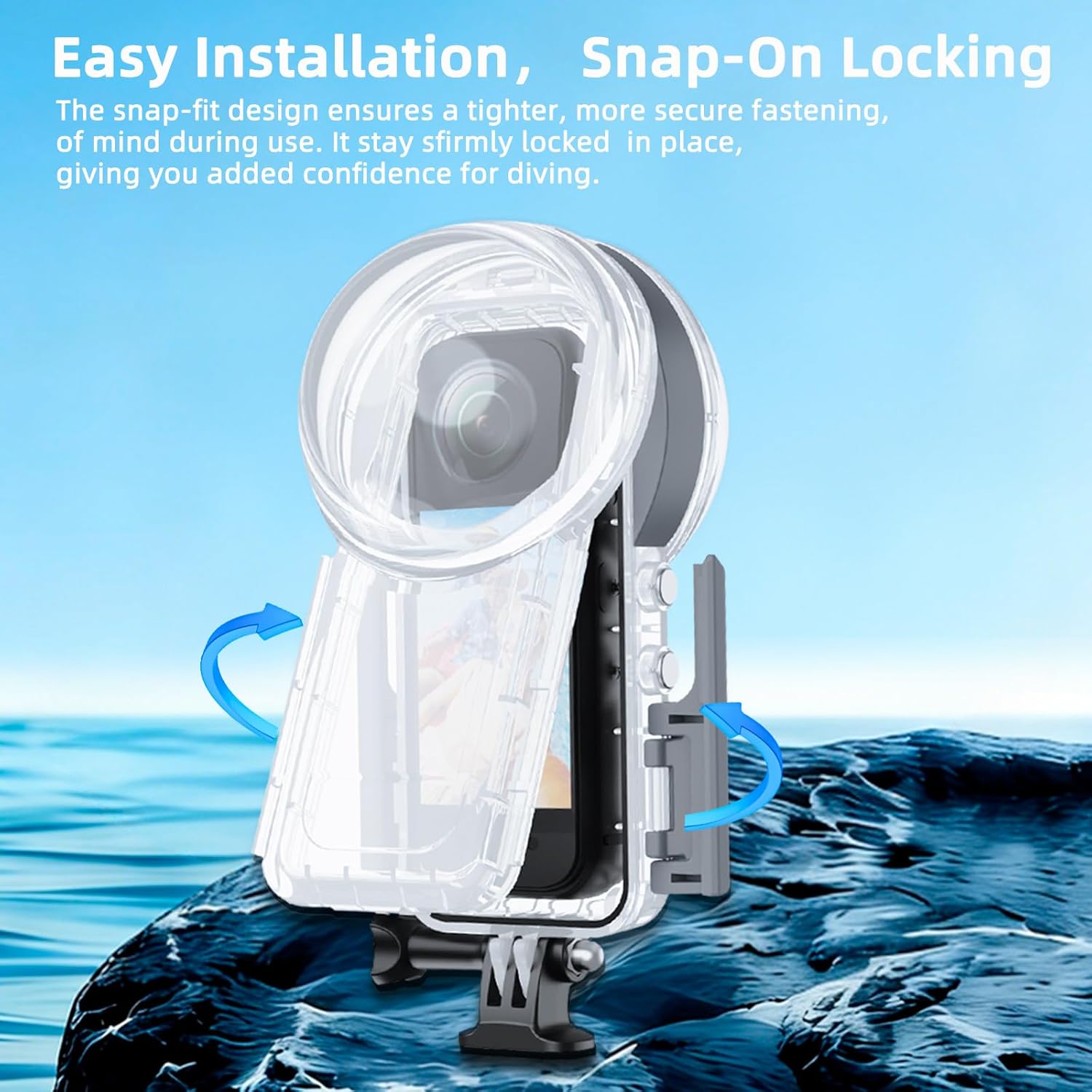 This waterproof case for the INSTA 360 X5 is designed to protect your camera during underwater adventures and extreme conditions. Constructed from durable explosion-proof PC material, this housing provides reliable protection while maintaining crystal-clear image quality. The case features a professional waterproof sealing structure that supports depths up to 164 feet, making it ideal for diving, snorkeling, and water sports. The specially treated optical AR coating on the ball face mask delivers over 95% light transmittance, ensuring your footage remains clear and distortion-free even in challenging underwater environments. The innovative design enables fully invisible panoramic splicing without blind spots, so you can capture complete 360-degree views beneath the surface. For added convenience, the waterproof case includes a protective cloth cover to prevent scratches during storage and transport. The Y-shaped base at the bottom is compatible with buoyancy arms and selfie sticks, giving you versatile mounting options for different shooting scenarios. Whether you're exploring coral reefs or documenting aquatic wildlife, this waterproof housing keeps your INSTA 360 X5 safe while delivering exceptional image quality.