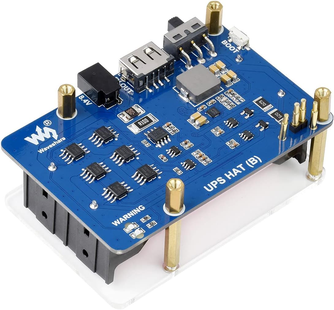 Overview Uninterruptible Power Supply UPS HAT (B) for Raspberry Pi, 5V output, up to 5A current, multi battery protection circuits, pogo pins connector, power your Pi seamlessly from power connection or the backup batteries. Features 1. Designed for Raspberry Pi series, compatible with Raspberry Pi 3 / 3B+ / 4B, etc. 2. I2C bus communication, monitoring the batteries voltage, current, power, and remaining capacity in real time 3. Multi battery protection circuits: over charge/discharge protection, over current protection, short circuit protection, and reverse protection, along with the equalizing charge feature, more safe and stable 4. Onboard 5V regulator, up to 5A continuous output current, more sufficient power source for Raspberry Pi 5. 5V USB output, convenient for powering other boards 6. Batteries warning indicators, easy to check if the battery is connected correctly 7. Comes with development resources and manual Specifications Output voltage:5V Charger:8.4V 2A Control bus:I2C Battery supported:2x 18650 Li batteries (NOT included) Dimensions:56 × 85mm Mounting hole:3.0mm Package Content 1. UPS HAT (B) x1 2. 8.4V battery charger x1 3. Acrylic protection panel x1 4. Screws pack x1 Note Development Resources and Technical Support are provided, please feel free to contact us if you have any problem!