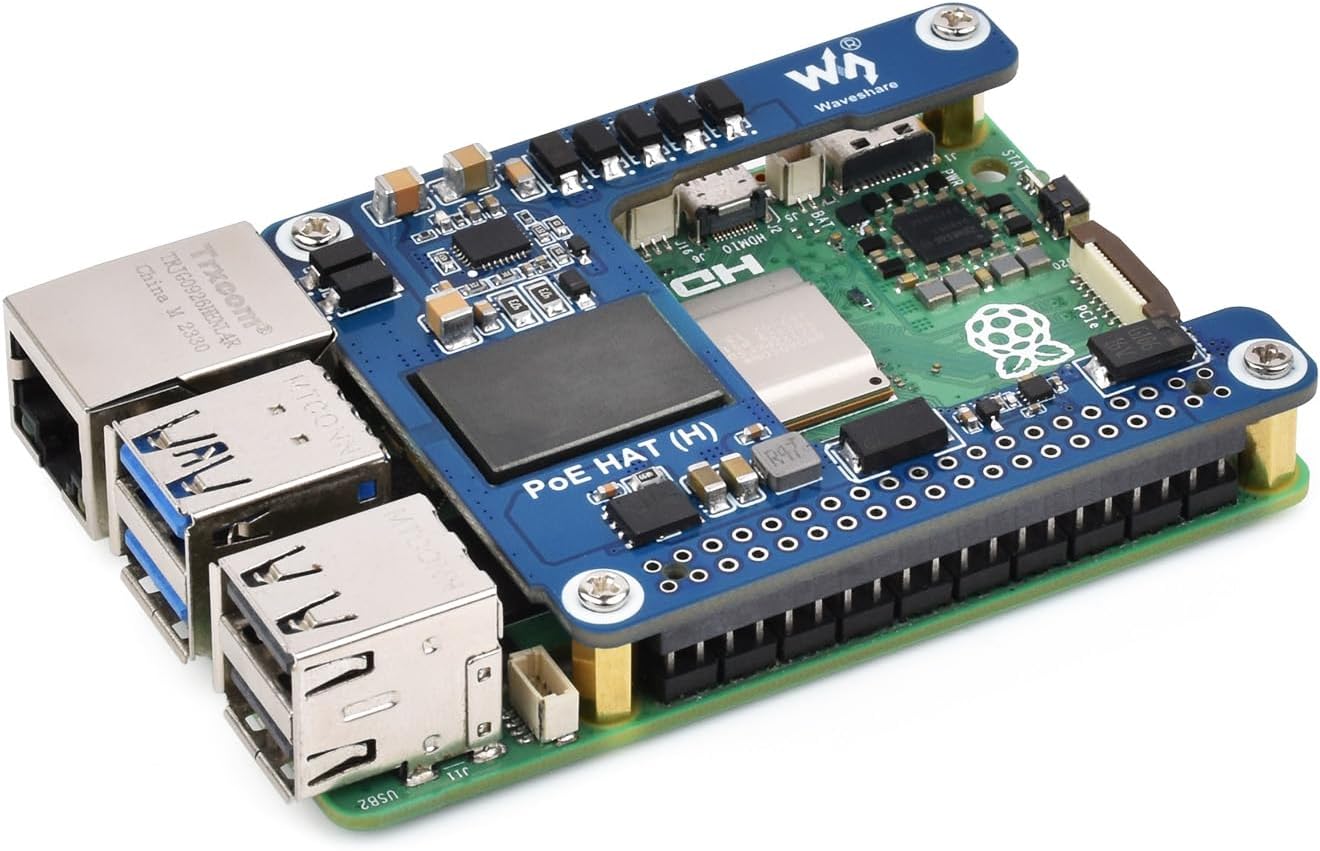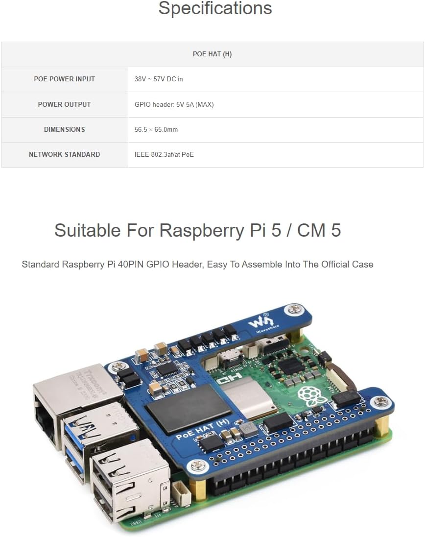 Introduction PoE HAT (H) is a power-over-Ethernet (PoE) expansion board for Raspberry Pi 5, supporting IEEE 802.3af/at network standards Designed to work with PoE routers or switches that support the IEEE 802.3af/at network standards, the Raspberry Pi can achieve both network connectivity and power supply with just a single Ethernet cable. Features Based on Raspberry Pi 40PIN GPIO interface Supports Power over Ethernet (PoE), supports IEEE 802.3af/at PoE network standard Adopts isolated SMPS (Switching Mode Power Supply) Compact and easy to assemble Specifications PoE input voltage: 37V ~ 57V DC input PoE-GPIO pin header: 5V 5A (MAX) Network standards: Supports IEEE 802.3af/at PoE Product size: 56.5 x 65.0 (mm) Application Example With This Product, You Can Use An Ethernet Cable With PoE Function To Power The Raspberry Pi 5 / CM 5 Directly Package Content PoE HAT (H) x1 Raspberry Pi 5 Official Case x1 Standoffs pack x1 FAQ 1.Can PoE HAT (H) be used on PI4B or PI3B+? No, PoE HAT (H) only supports PI5 2.Will PI 5 have a limited current warning? The Raspberry Pi board will detect the USB power supply current, if it does not reach the maximum current of 5A, the USB output will be limited, because the PoE HAT (H) is powered to the board through 40PIN, there will also be a current limit. You can add the following statement to the /boot/firmware/config.txt file to remove the current restriction: usb_max_current_enable=1