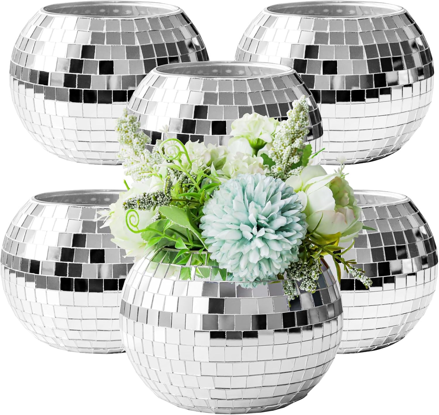 Centerpieces for Home: Use these small disco ball vases as a striking centerpiece in your living room, bedroom, or dining area. The silver disco ball can serve as a standalone decorative item or be filled with flowers, plants, or candles to enhance the ambiance. Holiday Event Decorations: Perfect for parties, weddings, chirstmas, new year, and thanksgiving, these vases can be used as disco ball centerpieces on tables, adding a festive and elegant touch to the decor. Interesting Office Spaces decor: Add a bit of flair to your office or workspace by using the mosaic disco ball vase as a decorative item. Mirror design of the silver vase can bring a sense of fun and creativity to a professional setting. Additional Outdoor Decor Features: While primarily designed for indoor use, these disco ball centerpieces can also be used in covered outdoor spaces like patios, porches, or gazebos. These mirror balls can add a unique and stylish touch to outdoor gatherings and events. Glitzy Accessories for Restaurants and Cafes: Enhance the dining experience by incorporating these mirror ball vases into the table settings or overall decor of restaurants and cafes. The disco ball vases can add a chic and modern touch to the ambiance. Gift Ideas of Disco Vase: These disco ball planters make for a unique and thoughtful gift for housewarmings, birthdays, holidays, or any special occasion. Its stylish design and versatile use make the disco room decor a delightful present for friends and family.
