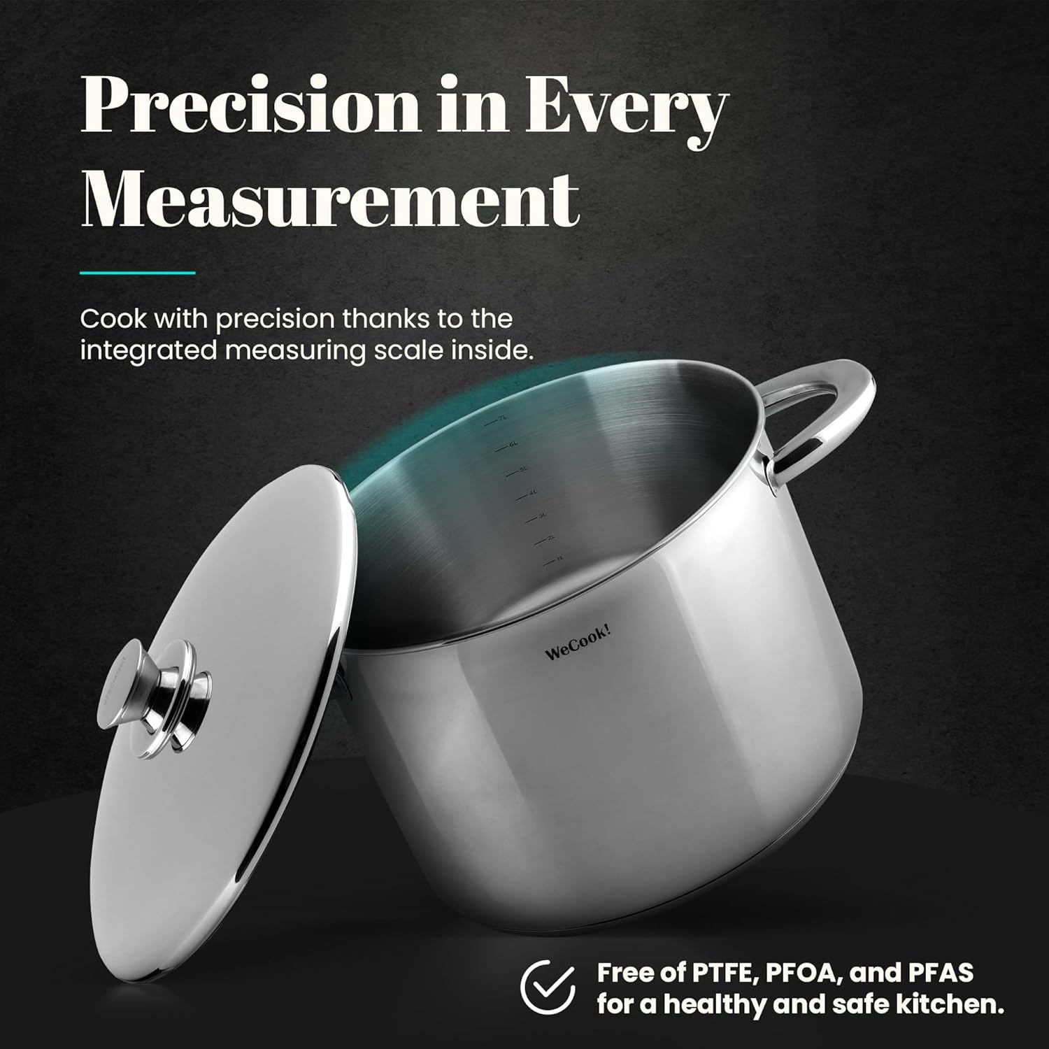 Made with meticulous precision from high quality 18/10 stainless steel, our pot combines exceptional durability with elegant design. Its straight lines and rounded edges add a touch of sophistication to your kitchen, making it a key element for any passionate chef. The glossy exterior finish adds a touch of luxury, while the matte interior creates the perfect backdrop for an exceptional dining experience. This balance between form and function ensures that every use is a celebration of upscale cuisine. The triple-layer, 4.3 mm thick encapsulated base guarantees perfect heat absorption, distribution and retention, providing flawless culinary results on any occasion. The handles and knob made of stainless steel, hollow and made of stainless steel, not only provide a comfortable grip, but also insulate from heat and keep the temperature comfortable when exploring new culinary creations. This pot is suitable for all heat sources, including induction. It can withstand temperatures of up to 200ยฐC in the oven and can be easily cleaned in the dishwasher, providing versatility and convenience with every use. Precision is key in every measurement with the built-in measuring scale inside. It facilitates the culinary process without the need for additional utensils, so you can fully focus on every taste and texture. In addition, our commitment to your health is obvious as it is free of PTFE, PFOA and PFAS and ensures a healthy and safe kitchen for you and your family.