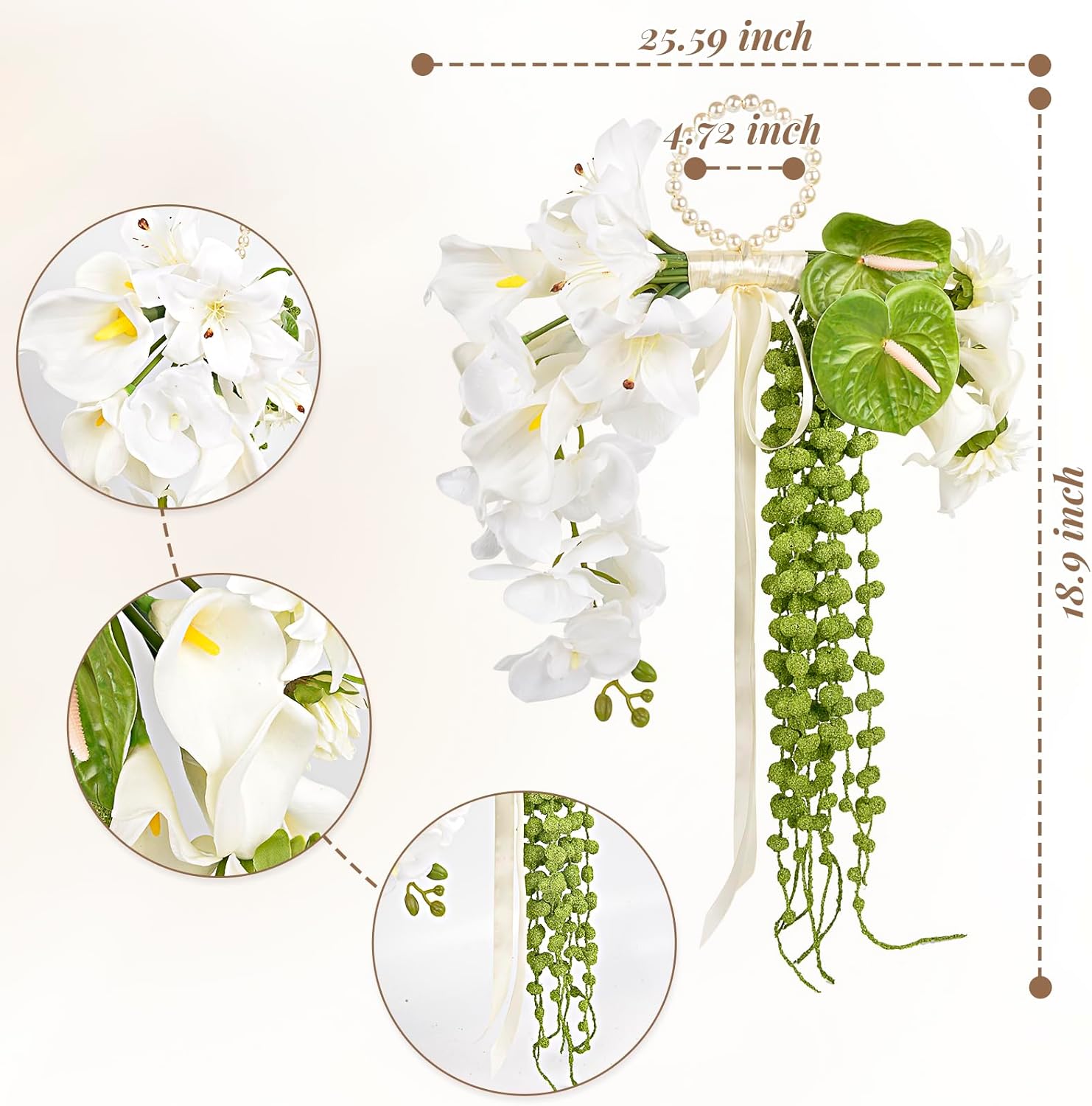 Wedding Bouquets for Bride Bridesmaid - White Artificial Calla Lily/Lily/Orchid Flowers with Pearl Handle & Ribbon, 18.9'' Handheld Bridal Bouquet for Wedding Marriage Proposal Party Church Decoration
