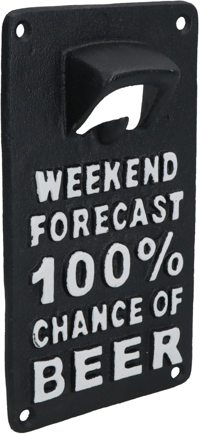This cast iron bottle opener will look great at any property and is a perfect gift for a loved one. Reads: Weekend Forecast 100% Chance of Beer. Decorative bottle opener to be wall mounted to bring a bit of humour and decoration to any room. Ideal for your kitchen, bar, man cave, garden, restaurant etc... Even have a cheeky drink while having some you time in the garage. A fun and stylish way to open your bottles. Cast iron wall-mounted bottle openers. Size: 17.5cm x 10cm