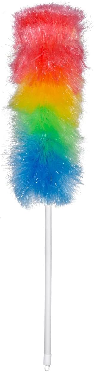 Product Description Feather duster with telescopic handle. Extendable up to 115 cm. Magical dust attraction due to static charging. Made of plastic. White telescopic handle with colourful duster head. Set Contains: Feather duster