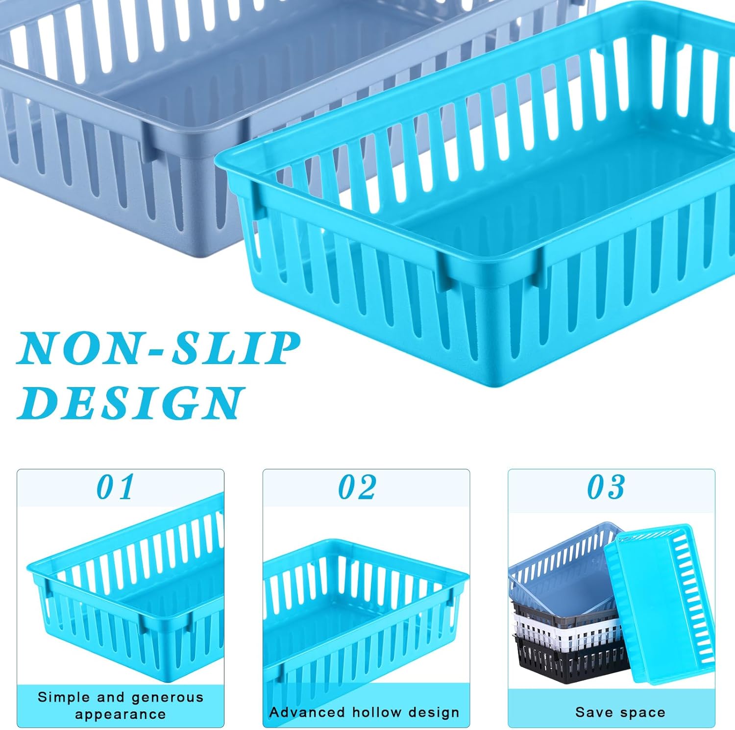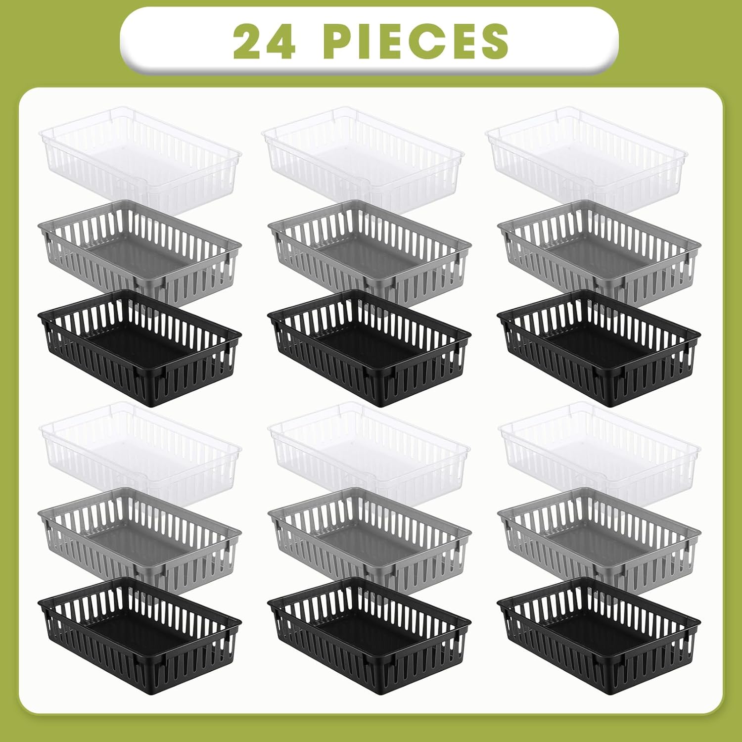 Features: Easy to clean: Being waterproof, these pantry organizer bins are perfect for storing items in damp environments like kitchens. Cleaning is a breeze, a quick wipes down with a damp cloth is all you need to keep these bins looking sharp and clean. Seamless blend: The black color of the plastic baskets ensures they blend seamlessly into any room setting. The elegant black design can add a touch of modern styling to any space, without causing any color clash. These bins fulfill both functionality and aesthetic appeal. Specifications: Material: plastic Color: black Size: about 10.24 x 6.5 x 2.36 inches/ 26 x 16.5 x 6 cm Package includes: 24 x Plastic storage baskets Notes: Manual measurement, please allow slight errors on size. The color may exist a slight difference due to different screen displays.