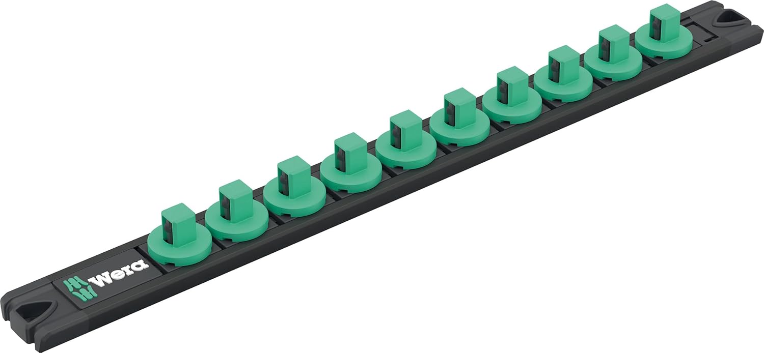 Socket rail with 10 Impaktor socket wrenches for use with electric or pneumatic wrenches with 3/8" drive. The Impaktor technology ensures a higher-than-average service life even at extreme requirements. The hexagon profile used allows a high power transmission while simultaneously being precise and protecting the profile. With "Take it easy" Tool finder with colour coding by size - for quick and easy identification of the required tool. The rail allows temporary attachment to metallic surfaces and, with its twist-to-unlock function, ensures secure locking and unlocking of the sockets. 10x 8790 B Impaktor socket with 3/8" drive: 10x30 mm, 13x30 mm, 15x30 mm, 16x30 mm, 17x30 mm, 18x30 mm, 19x30 mm, 21x32 mm, 22x32 mm, 24x32 mm; 1x 9603 Impaktor socket rail, 1/2", empty: 30 x 340 mm