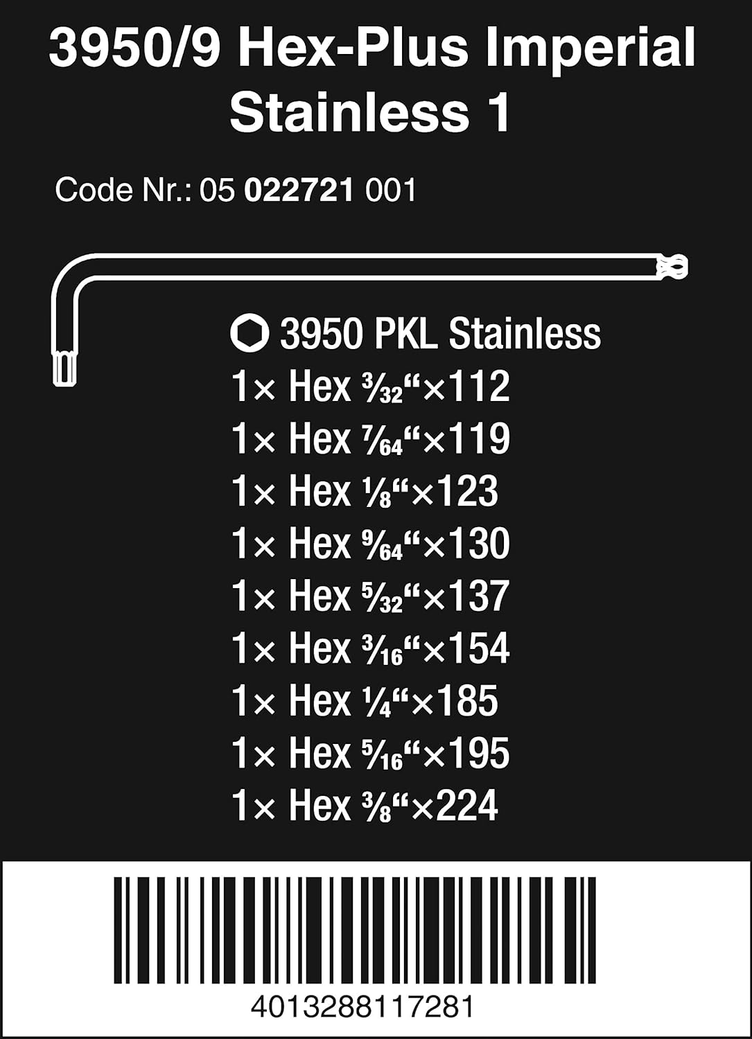 | Item Type Name | 3950 PKL/9 SZ INCL. POUCH LONG ARM BALLPOINT HEX KEY SET |