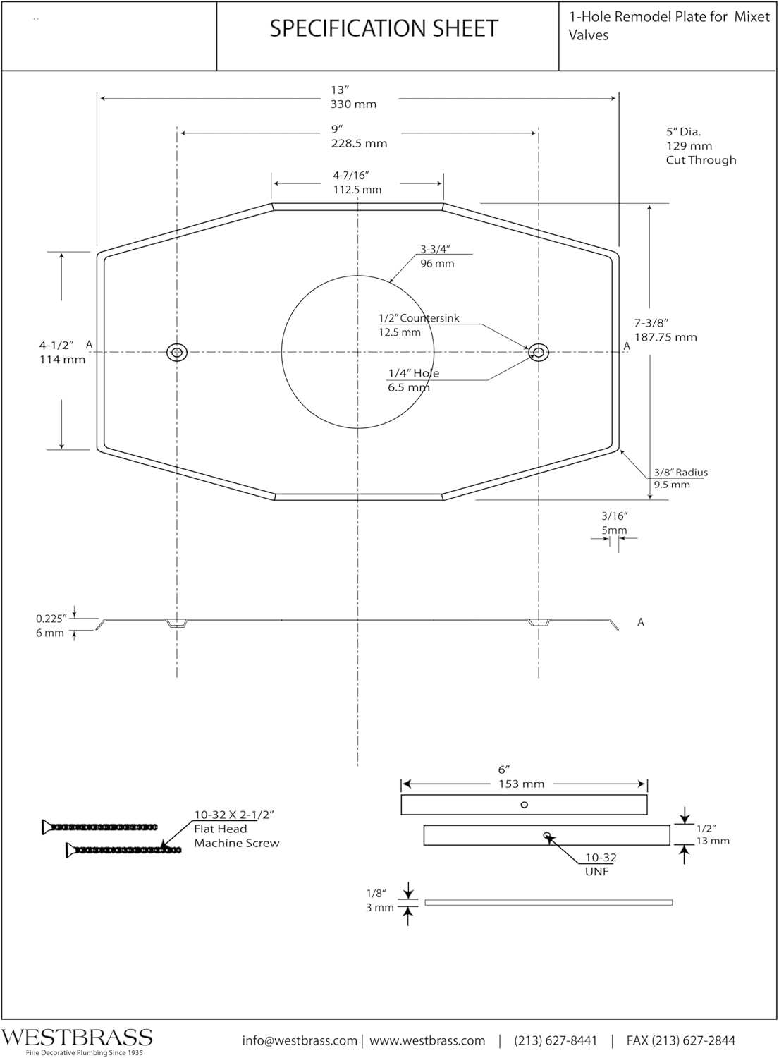 This Westbrass remodel plate allows an installer to replace a 2 or 3 handle tub and shower valve with a single handle pressure balancing valve, without rebuilding the wet wall. Remodel plates are also often useful for covering incidental damage around an existing shower valve. 1 Hole remodel plate fits Mixet single handle valves. Includes two bolts and mounting bars. 13 inch overall width. 7-1/2 inch at tallest point. Be sure to check out our other model styles and VISIT OUR WESTBRASS STOREFRONT for more kitchen and bath items to stylize your home with convenient functionality and beauty.
