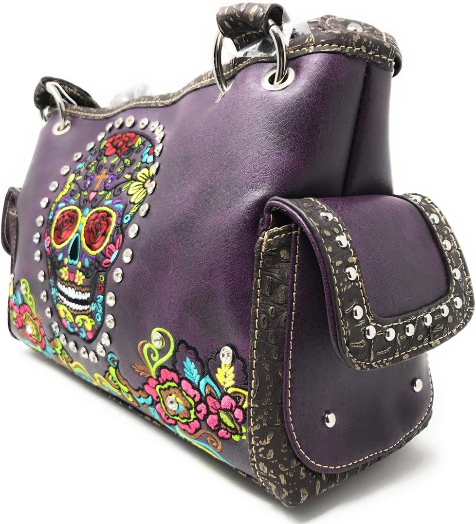 Western Women's Fashion Sugar Skull Embroidery Handbag Purse in 6 Colors. Pocket Size: 9" x 6", fits most things for easy access. Outer Material: Other Leather Size: approximately 13" x 9" x 5". Handbag with 2 compartments inside. Zip closure on top and inside. 2 side pockets with button closure on the side. Extra pocket on the back is for everything easy to get, like keychains, phones. iPhone/iPad pocket is designed to fit your phones. Multi-color candy skull premium handbag with chrome studs and top-quality embroidered accents.