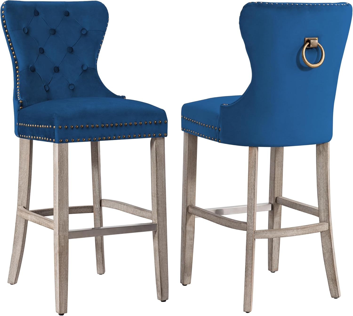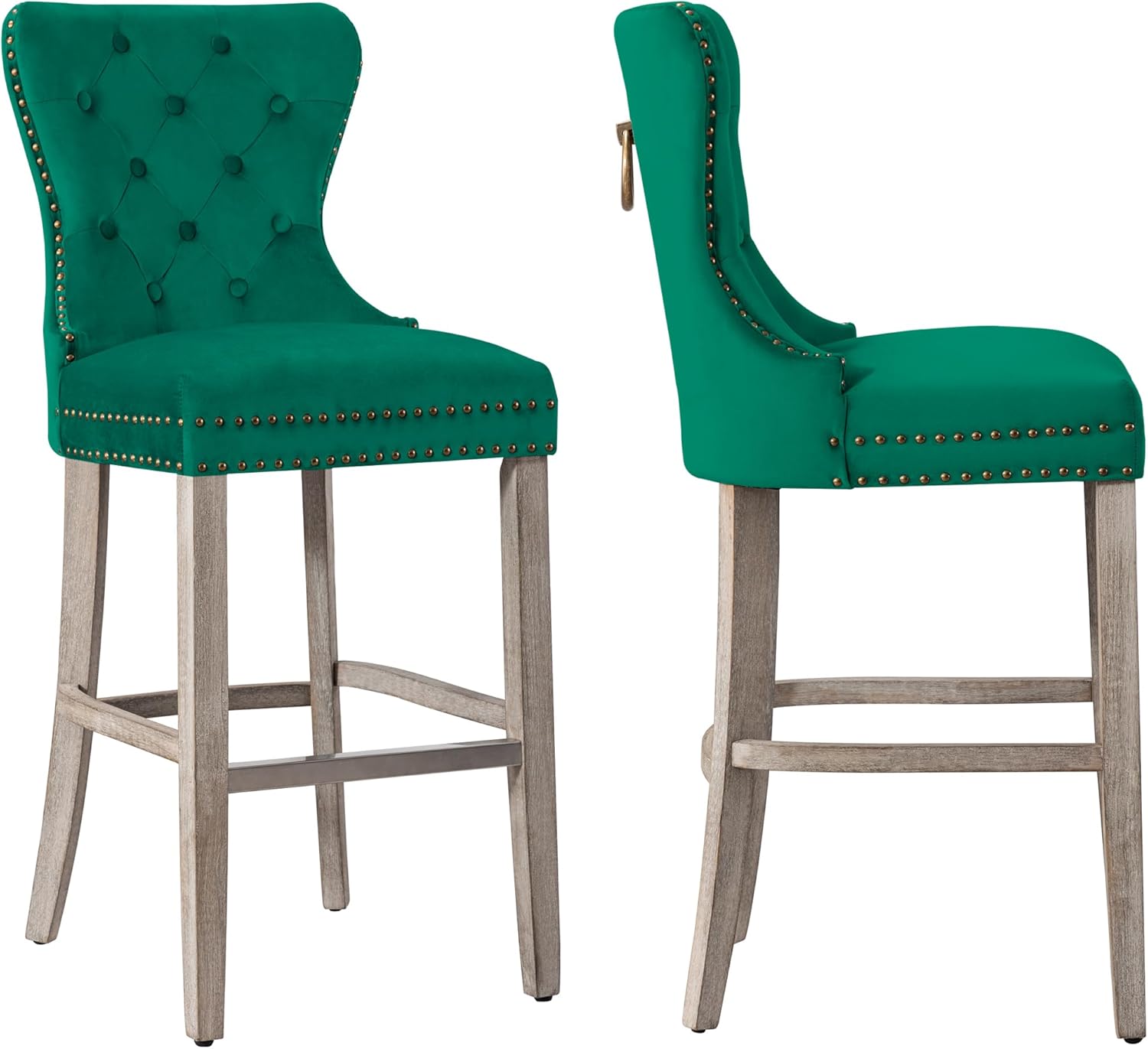 | Additional Features | 29" Bar Height Base, Adjustable Feet Levelers, Antique Grey Wooden Legs, Soft Foam Cushion with Tufted Velvet Fabric, Wingback Backrest with Pull Bar |