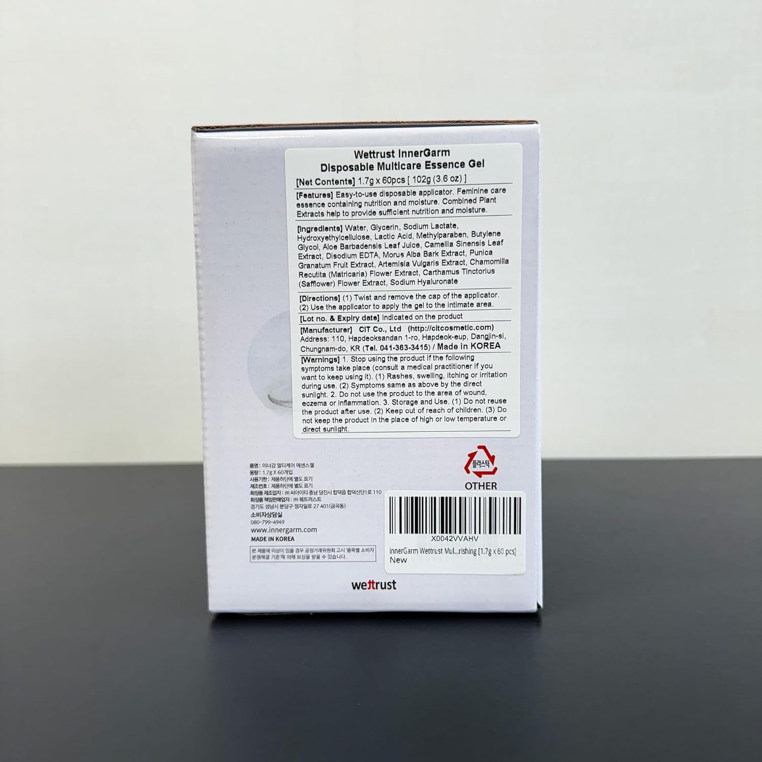[ Descriptions ] Volume: 1.7g x 60 applicator Made in Korea [ Ingredients ] Water, Glycerin, Sodium Lactate, Hydroxyethylcellulose, Lactic Acid, Methylparaben, Butylene Glycol, Aloe Barbadensis Leaf Juice, Camellia Sinensis Leaf Extract, Disodium EDTA, Morus Alba Bark Extract, Punica Granatum Fruit Extract, Artemisia Vulgaris Extract, Chamomilla Recutita (Matricaria) Flower Extract, Carthamus Tinctorius (Safflower) Flower Extract, Sodium Hyaluronate [ Cautions ] Recommended to use one at a time Keep out of reach of children Reuse Banned