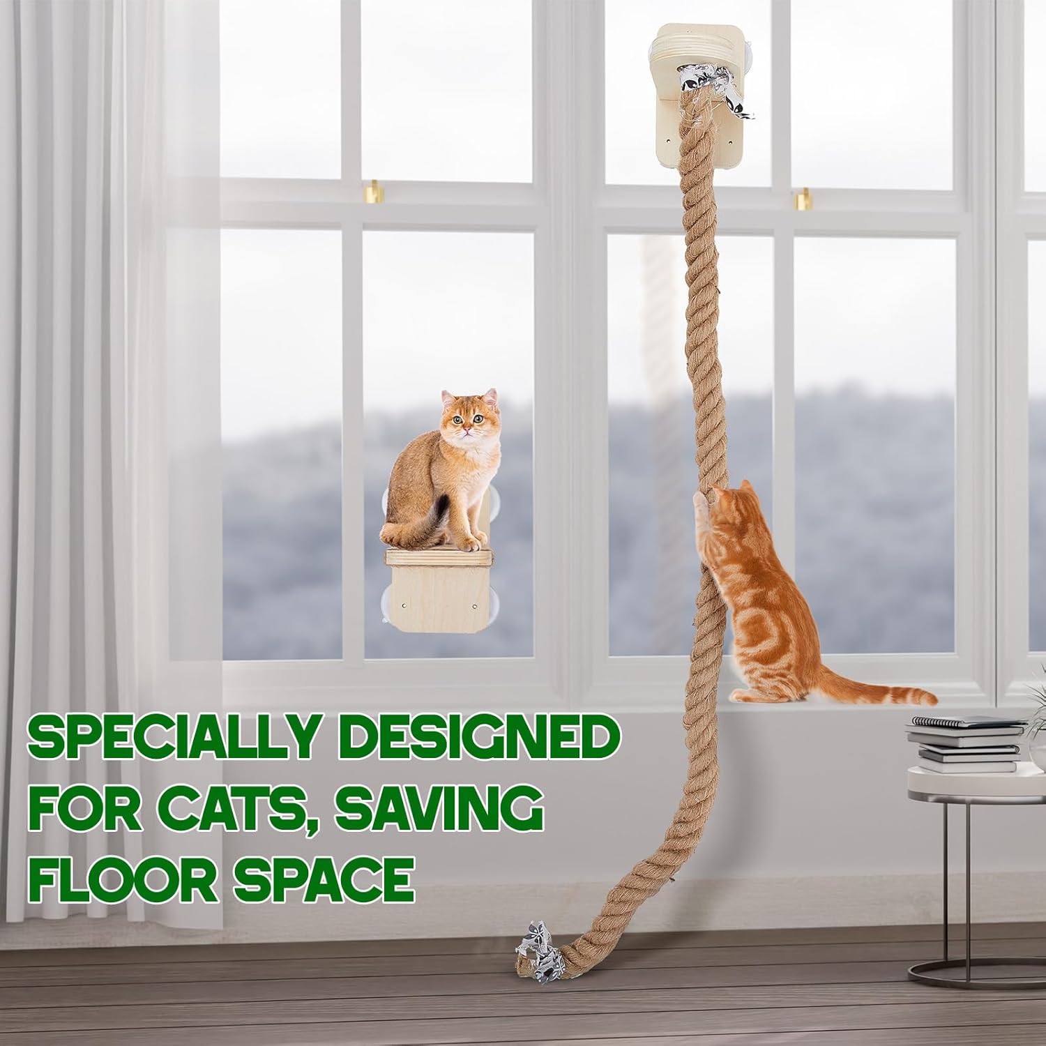 Features: This meticulously designed cat structure not only encourages playful exploration but also provides an enticing experience that aligns with your cat's climbing instincts Mount this elegant cat entertainment system to your window, effectively conserving floor space and turning even compact apartments into dynamic cat-friendly zones. Specifications: Material: solid wood and thick yellow jute rope Color: yellow Size: 59.1 inch Package includes: 2 Pcs cat window steps and 1 Pcs cat climbing rope Notes: Manual measurement, please allow slight errors on size. The color may exist a slight difference due to different screen displays