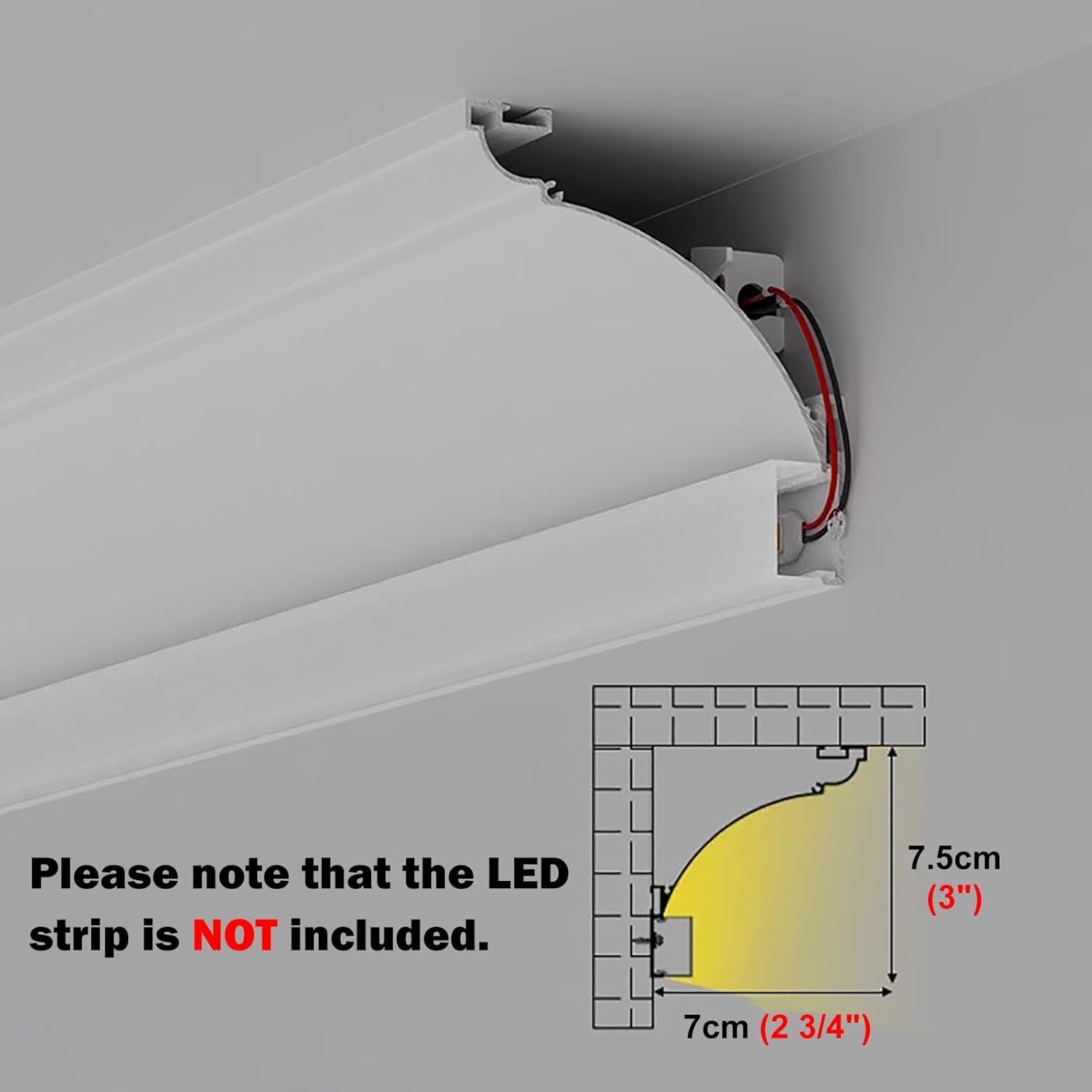 Transform your living space with our versatile crown molding lighting solution, designed to enhance any room's ambiance with its soft, inviting glow. This LED skirting board not only provides effective illumination but also adds a touch of elegance to your home decor, making it an ideal choice for various environments, from cozy living rooms to modern kitchens. **Specifications:** - **Material:** Durable aluminum - **Color:** Crisp white - **Size:** 7.5cm x 7cm (3" x 2 3/4") - **Length:** 1m (3.3ft), customizable to fit your needs - **Compatible LED Width:** ≤ 8mm (5/16") **Key Features:** - **Customizable Length:** Easily cut to your desired size for a perfect fit. - **Dust Protection:** Safeguards your LED strips from dust and damage. - **Ambiance Enhancement:** Provides soft lighting that elevates your decor and creates a welcoming atmosphere. - **Durable Design:** Crafted for longevity while maintaining its aesthetic appeal. - **Simple Installation:** Effortlessly installs on walls or ceilings without the need for suspended ceilings or grooves. **Package Includes:** - 1 x Aluminum Channel **Please Note:** - Corner connectors are available upon request. - LED strip not included; ensure the width is ≤ 8mm for compatibility. - Use seam sealer/repair paste (not included) for a seamless finish. - Minor dimension variations may occur due to manual measurements. - The item's color may slightly differ from the images due to lighting and screen settings. **Customer Support:** We are committed to your satisfaction. If you encounter any issues with our product, please don’t hesitate to reach out to us for assistance. Upgrade your home lighting with our crown molding solution and experience the perfect blend of style and functionality.