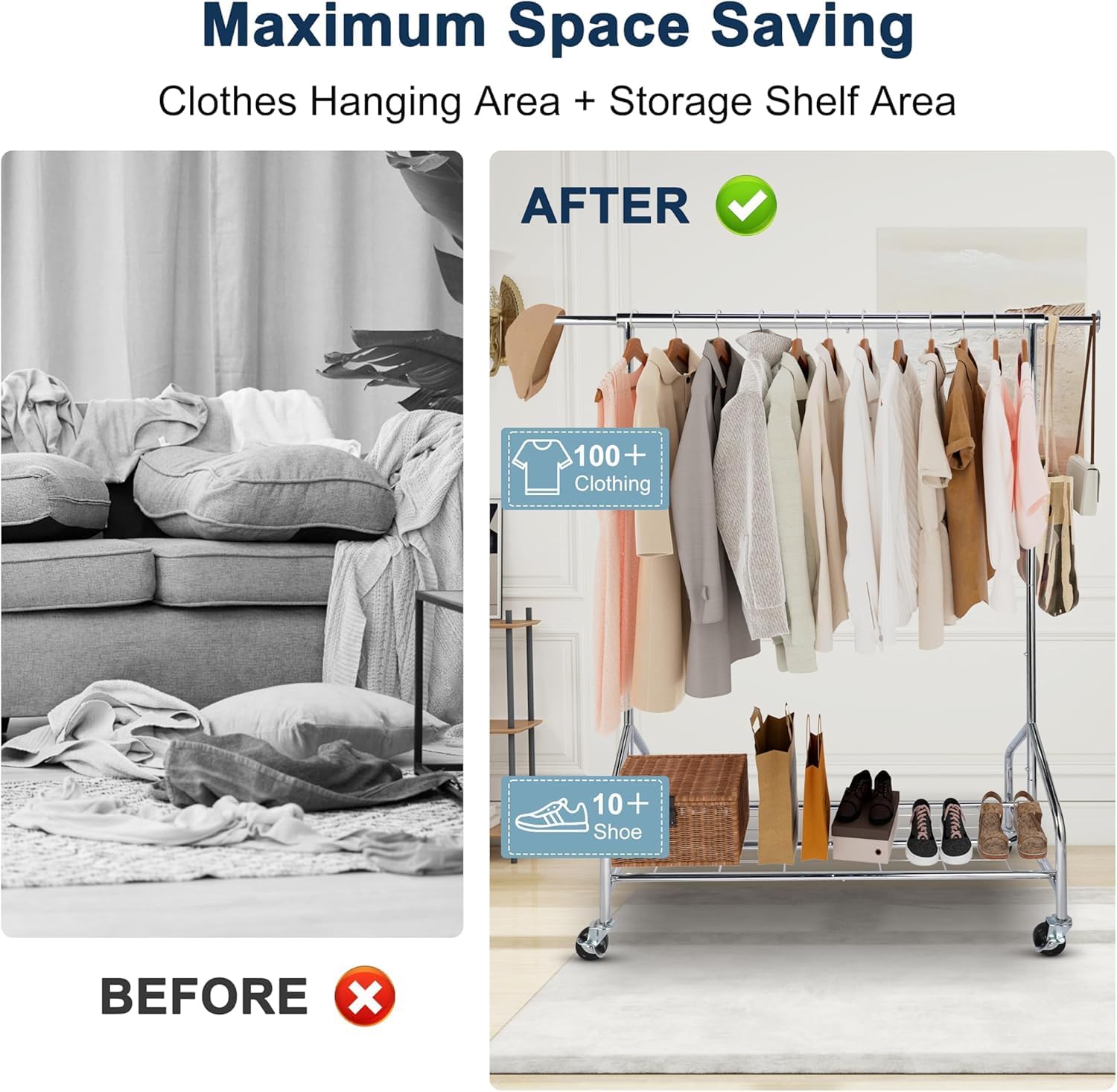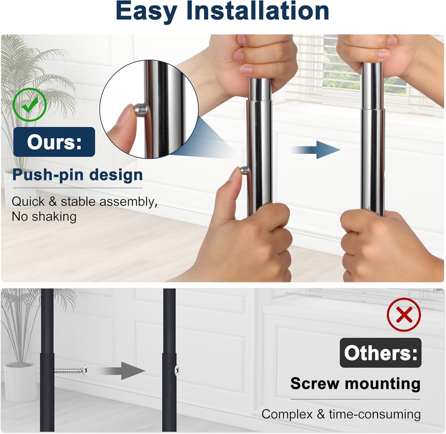 The Whitmor adjustable clothing rack combines heavy-duty functionality with versatile design, featuring a extendable top rod (45.5"-69.1") and adjustable height (65.2"-70.5") to maximize vertical storage in bedrooms, laundry rooms, or retail spaces. Constructed from thick steel pipes with a triangular reinforced frame and chrome-coated finish, it supports 450LBS total—200LBS on the middle rod, 200LBS on the bottom shelf, and 25LBS per extendable side rod—resisting rust while preventing wobbling for heavy coats or luggage. Four 5.3" silent rubber wheels (2 lockable) enable smooth 360° mobility on any floor, securing in place with scratch-proof brakes. Unlike traditional racks, its push-pin design ensures hassle-free assembly for renters or dorm rooms, while the versatile layout organizes clothes, scarves, and shoes—transforming cluttered living rooms, laundry areas, or commercial spaces into tidy, functional zones.