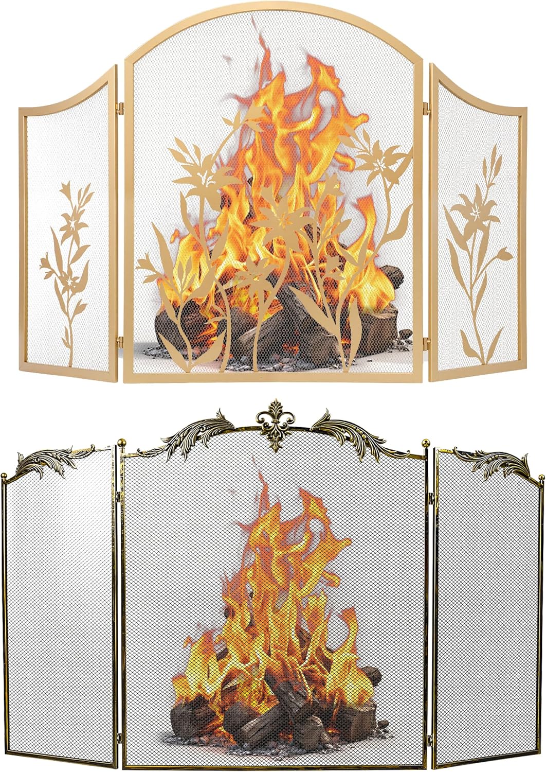 WICHEMI Fireplace Screen 3 Panel Folding Fireplace Screens Metal Furnace Fireguards Mesh Cover Baby Safe Proof Fence Spark Guard Cover Wrought Iron Fire Place Standing Gate (Style 2+Style 8)