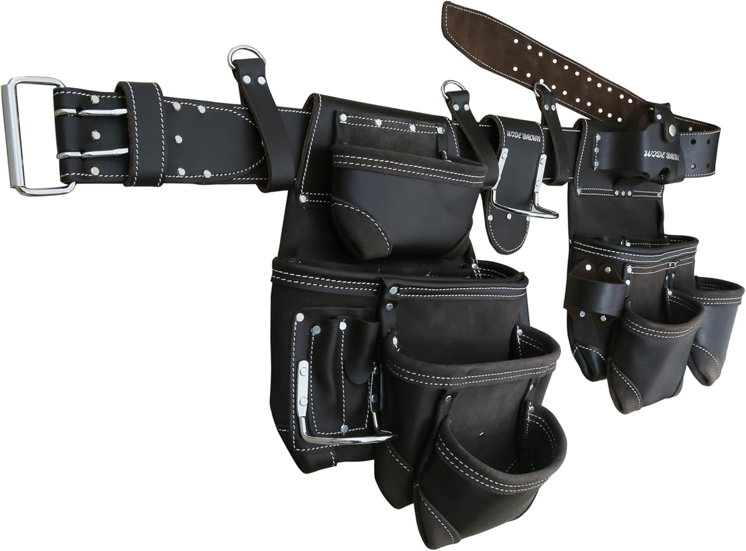oil-tanned split leather tool rig, specifically designed for heavy-duty work environments, likely suited for professionals in construction, carpentry, or other fields requiring durable tool organization. Technical Specifications: 1. Material: The tool rig is crafted from oil-tanned split leather. This type of leather is specially treated with oils during the tanning process, enhancing durability, flexibility, and water resistance. The oil-tanning process helps in maintaining the leather's integrity under harsh conditions and provides a sleek finish. 2. Design & Compartments: The tool rig includes multiple pockets of various sizes to accommodate a wide range of tools. This includes large pouches for holding bulky items and smaller compartments for nails, screws, and other small hardware. The design also incorporates loops and sleeves for specialized tools like hammers, wrenches, and pliers, ensuring they are easily accessible. 3. Belt Features: The belt is adjustable with multiple hole options, allowing it to fit various waist sizes comfortably. Its wide design helps distribute weight evenly, reducing strain on the user. Heavy-duty buckle construction ensures the belt remains secure under heavy loads. 4. Reinforced Stitching and Rivets: The stitching is reinforced and contrasts with the leather, adding both aesthetic and structural benefits. Double stitching at stress points increases durability and prevents tearing. Metal