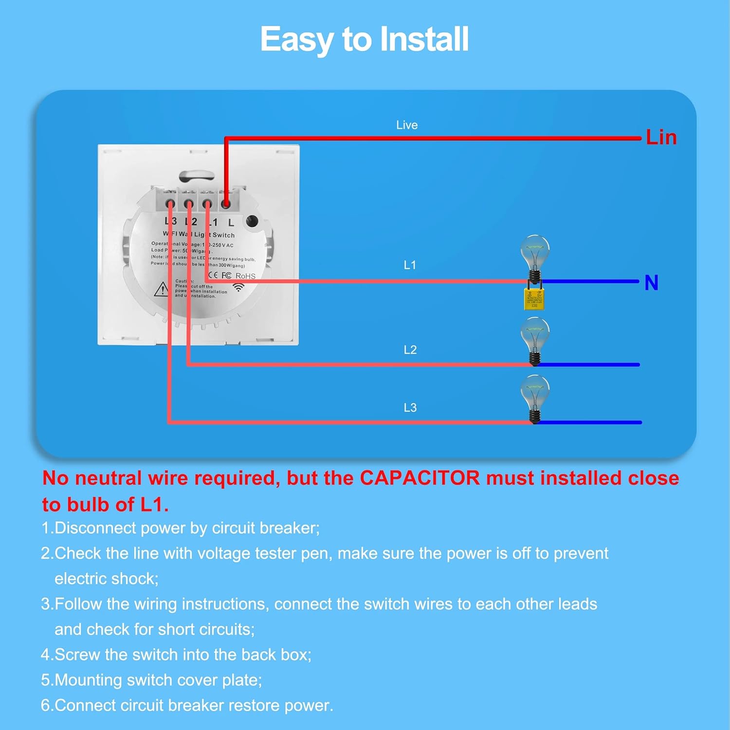 Light Switch Touch Light Switch Compatible Through smart speakers and smart voice assistants voice control is achieved Touch Screen Touch Panel, Voice Control, Time Function, Overload Protection Wireless Wall Switch installation in parallel, or 2 or 3 lighting switches the same lamp Work perfectly in ladder mode, programmed master and slave mode from the Smartlife application only one is going to be stitched into the spotlight and the other switch is just going to connect to phase and neutral to power only switch This touch switch supports the maximum power of 2200W, which can work with most lights and other electrical devices, connect to your smartphone and control your home appliances with ease. The user can control this Wi-Fi plug-in via the voice via the device to turn off the switch whose support timer function (works in offline state) that includes countdown; single and repeat timers can be Set Max. 8 groups of timers The user can use a smartphone to remotely control the home electronics remotely anytime, anywhere as long as the phone has 2G / 3G / WIFI network compatible with iOS and Android operating system Compatible with (Echo / Dot / Dot / Tap / Assistant / Home / IFTTT). Flight ticket counter turn your lights on or off with your voice, No hub required The intelligent timer switch will automatically turn on after setting a timer for this switch, which is essential for daily scheduling, and bring you a comfortable and intelligent lifestyle. Tempered glass touch screen of this diy smart switch is sensitive to the touch of control, premium durable glass material provides up to 20 million touch figures through our rigorous testing Download the Smartlife from the App Store or Play Store and connect your mobile device to your 2.4 GHz Wi-Fi network to find your light switch, then you can turn the lights or control other electrical devices with ease