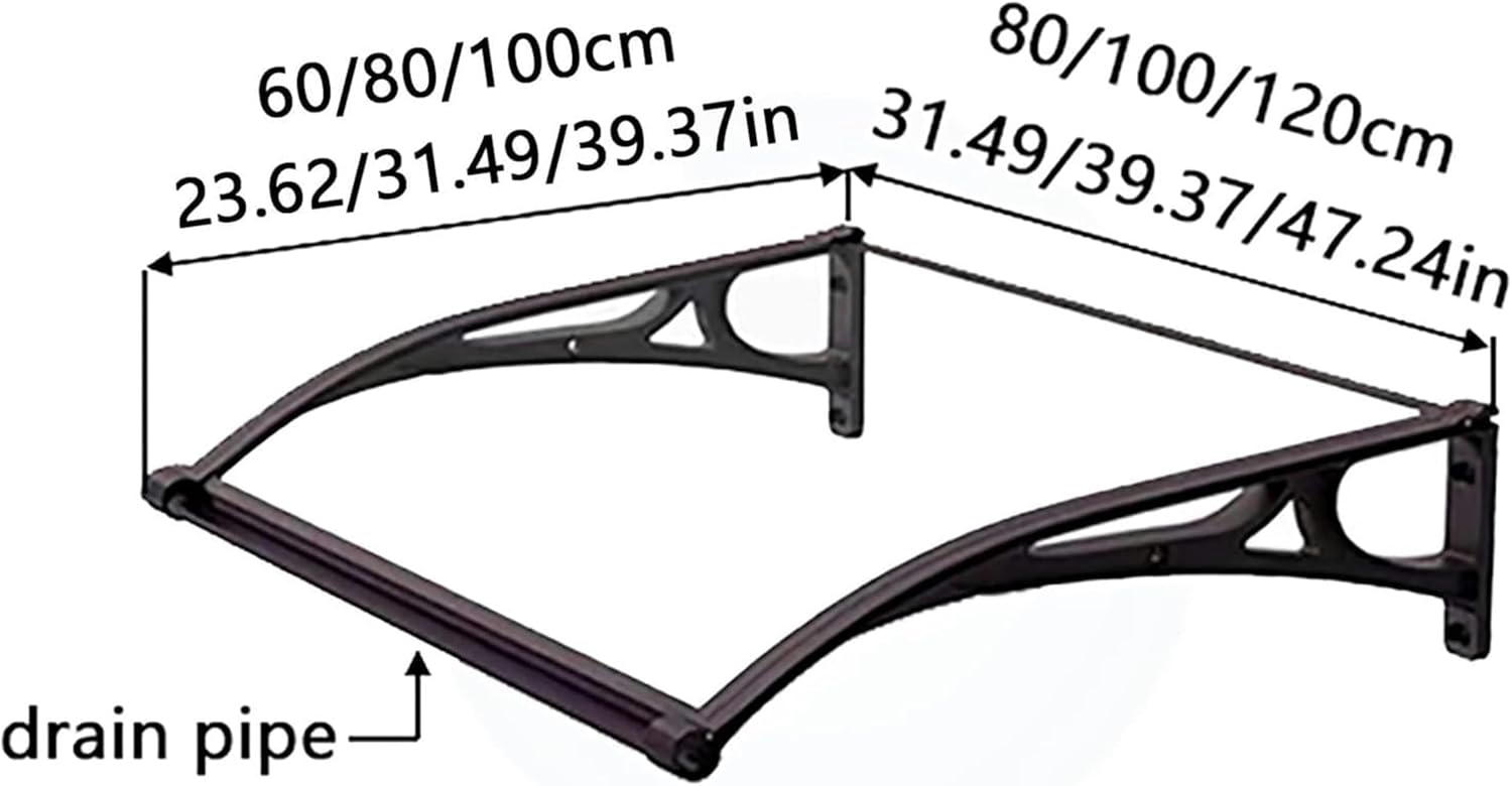 - The Patio Awning offers UV protection and exceptional light transmission.- This window awning canopy provides defense against wind, sun, rain, snow, and harmful UV rays.Product Specifications:- Product Name: Door Awning/Window Awning/Front Door Canopy- Panel Material: Polycarbonate- Bracket Material: Aluminum Alloy- Operating Temperature: -40℃ to +120℃- Sunproof: UV50+- Applicable Scenarios: Outdoor doorways, roofs, windows, house entrances, balconies, waiting rooms, garden doors, garage entrances, and other buildings.- Multiple awnings can be connected to cover larger entrances and walkways.Package Includes:- 1 × Awning- 1 × Screw BagNote:1. Due to manual measurement, the finished product may have an error of 1-2 cm; please understand.2. The product color may vary slightly due to lighting during photography or your monitor.