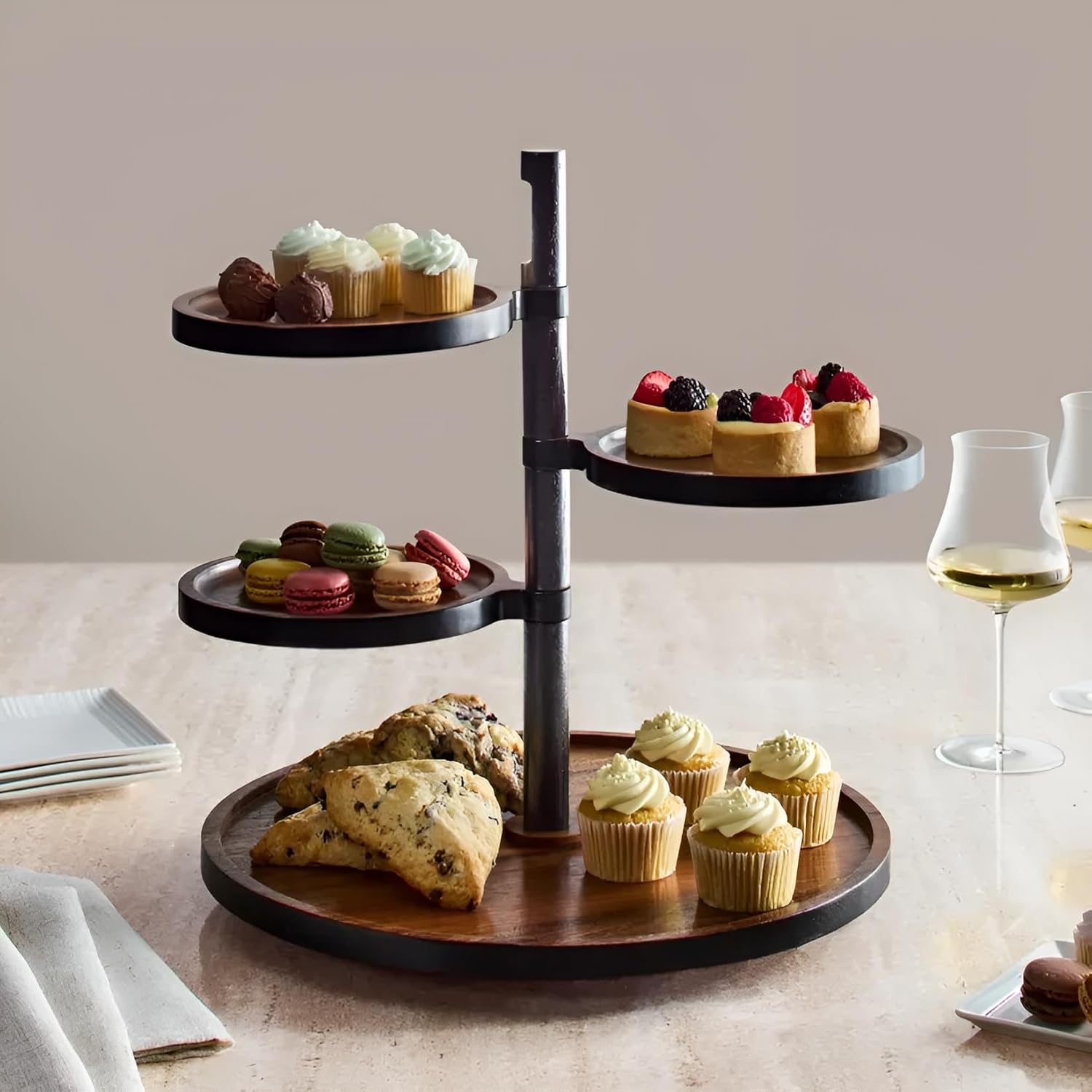 Make your next gathering effortless and stylish with the Wine Enthusiast Adjustable Tiered Server with Lazy Susan Base, the perfect serveware solution for entertaining at home. Whether you’re planning a casual cocktail hour, a full-scale party or a cozy dessert spread, this versatile piece adapts to your needs with elegance and ease. Crafted from rich acacia wood with sleek, black-finished edges, this server combines warmth and sophistication. The bottom tray serves as a stable Lazy Susan rotating board, making all your treats accessible from every angle for dining tables, buffets, or kitchen counters. Attach one, two, or three tiers to the center pole depending on the space available or how elaborate your display needs to be.
