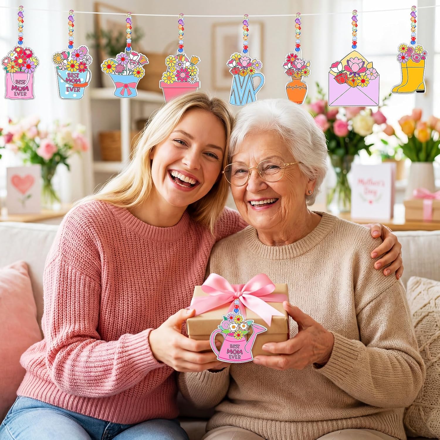 Features: Celebrate Mother's Day with a meaningful DIY experience using this 30-piece Mother's Day suncatcher ornament set. Designed for group crafting and shared creative moments, this bulk set offers a simple yet heartfelt way to create handmade decorations that express love and appreciation. Ideal for Mother's Day parties, family gatherings, and group DIY activities, this 30-piece bulk set makes planning easy while delivering a memorable, hands-on experience and charming light-catching decor for the season. Specifications: Material: plastic Color: clear Size: around inch(H) Package includes: 30 x Sun catchers 300 x Acrylic beads, 30 x suction hooks 15 Meters of fishing line 30 x Paintbrushes (with enough paint) Notes: Manual measurement, please allow slight errors on size. The color may exist a slight difference due to different screen displays Winding risk may exist, please keep our product away from children