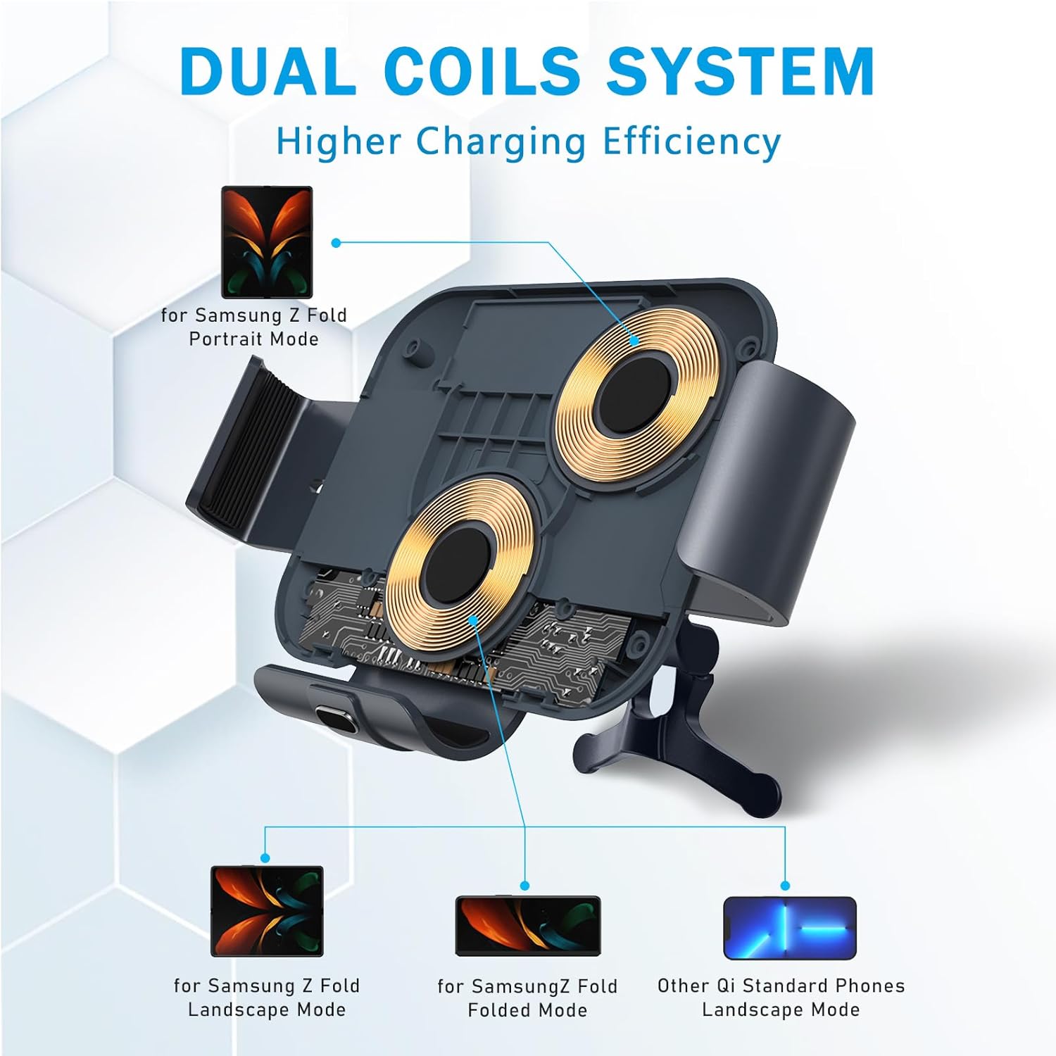 Acteam Car Wireless Charger Phone Holder for Samsung Galaxy Z Fold 5/4/3/2/S22 Ultra, Dual Coil 10W Fast Charging Auto-Clamping Car Air Vent Dashboard Phone Mount for Galaxy Z Fold/Note