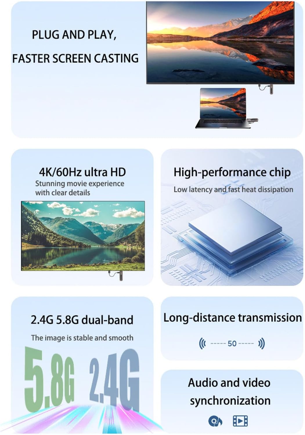 Spec: Item Type: Wireless HD Transmitter Receiver Kit Material: ABS and PC Resolution: 4K at 60HZ Transmit Distance: Approx. 50m / 164ft Frequency: 2.4G/5.8G dual band How to Use: Plug and play Package List: 1 x Transmitter 1 x Receiver 2 x Protective Caps 2 x Supply Cords 1 x User Manual 1 x Adapter Cable