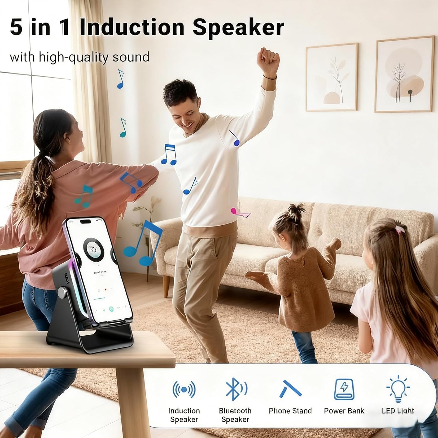Product Description Name: 4 in 1 wireless speaker stand Product Dimensions: 4.25*3.5*5inch Item Weight: 14 Ounce Material: ABS Color: Black/White Battery Capacity: 3500mAh Adjustable Angle: 360° Playtime: 5 hours Output Power: 5W Interface: Type-C Package Includes: 1 Pc * 5-in-1 Wireless Induction Bluetooth Speaker 1 Pc * Phone Stand (Random Color) 1 Pc * Type-C Data Cable 1 Pc * User Manual 【Tips】 1.Due to manual measurement, please allow an error of 1-2cm. 2.Due to the different display and different light, the picture may not show the actual color of the item. Thanks for your understanding.