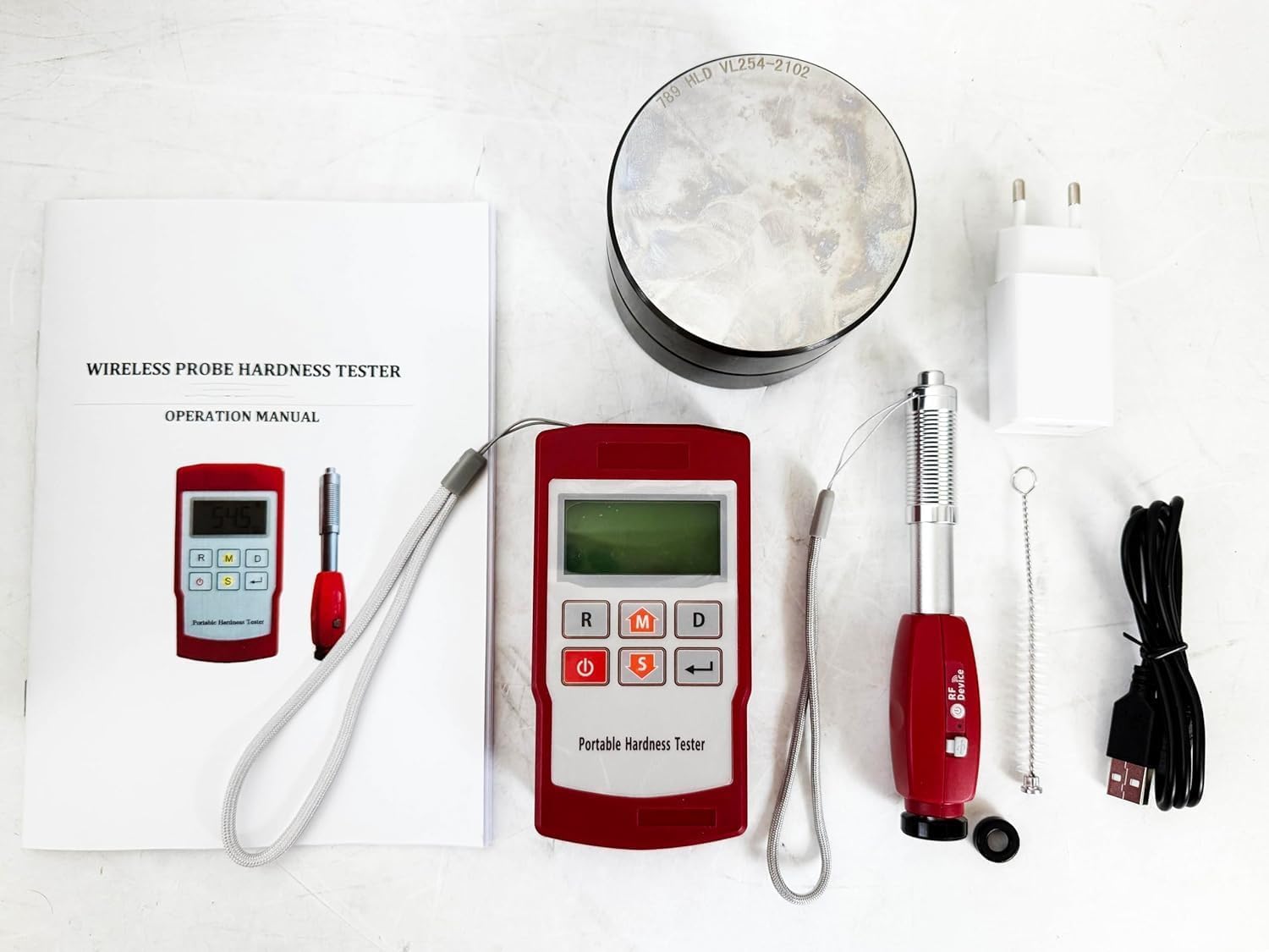 Introduction:◆This hardness tester is an innovation of portable leeb hardness tester. It works with a wireless probe, The wireless probe can transfer measuring hardness value to main unit wirelessly via RF module within the range of 10 meters. There is a rechargeable Li-ion battery inside RF probe and can be charged directly by USB port of PC. The main unit with LCD display can be placed around anywhere. Besides, the main unit with magnetic housing can also be attracted upon to the surface of workpiece to avoid of dropping to damage. Advantages:◆1. wireless probe ◆2. Universal impact direction mode, it does not need to set up different impact direction.◆3. Linear accuracy for any angles ◆4. Different probe can be indentified automatically ◆5. No compensation for impact direction ◆6. Dual values ( Leeb value and one conversion value) can be displayed at the same screen ◆7. Ten testing materials including forged steel Technical Specifications◆Methods of measurement: measurements of hardness on the Richter scale◆Accuracy / repeatability: ±HRC0.2◆Hardness scale: HL/HRC/HRB/HB/HV/HS/ σb ◆Measuring range: HL170-960/HRC17-69/HRB13-101.7/HB20-655/HV80-940/HS32-99.5/ sigma B (RM) 255-2180N/mm2◆Communication distance: open area 10m◆Impact direction: full angle◆Impact device: Wireless probe D◆Storage capacity: 300 data can be stored and read again◆Statistics: automatic calculation◆Calibration: user can calibrate by himself◆Automatic shutdown;Low power prompt◆Alarm: upper and lower alarm◆Power supply, 2 1.5V, AA alkaline battery (host), 3.7V lithium rechargeable battery, USB interface charging (wireless probe)