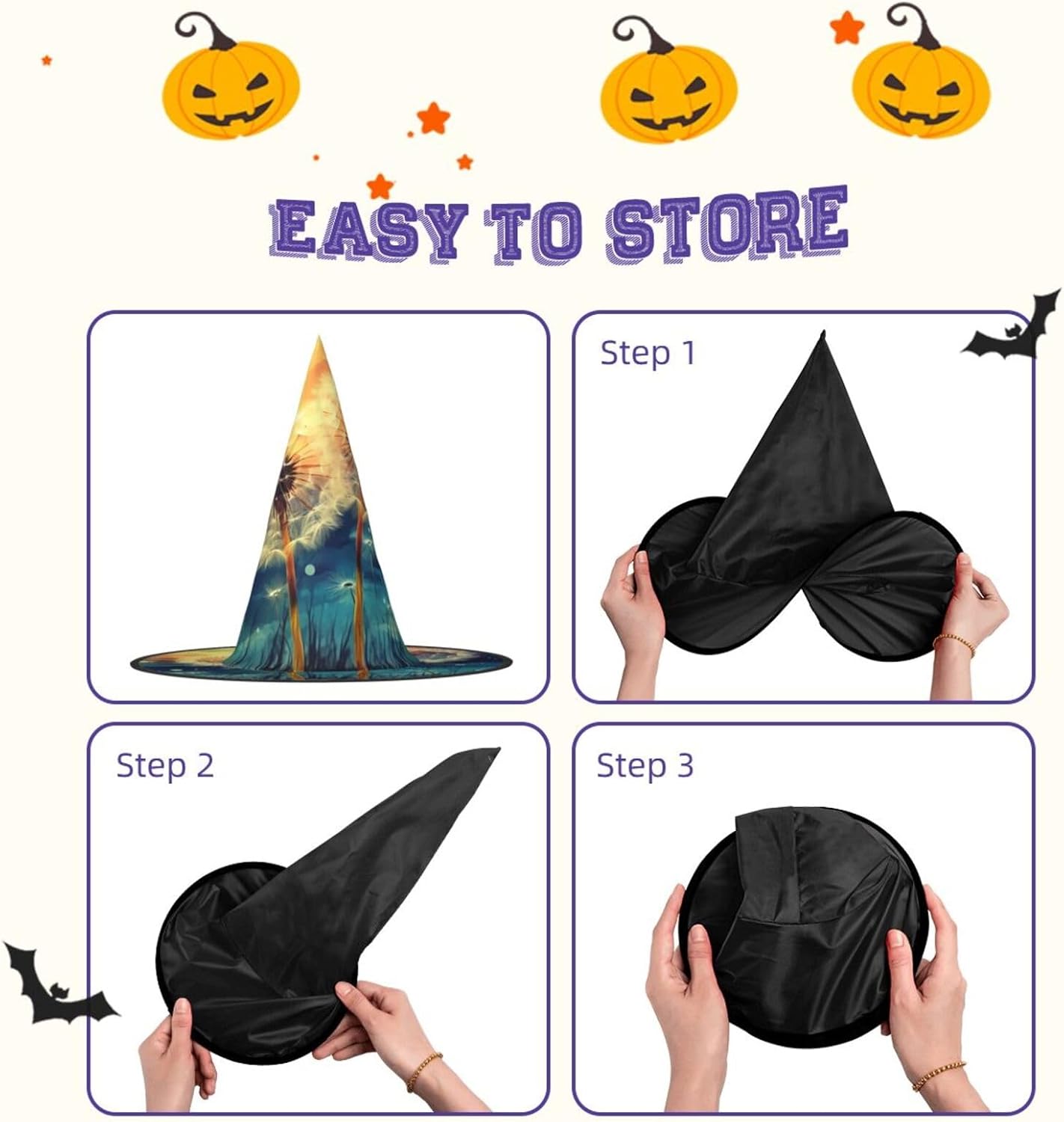 Features:\r\nDandelion Drawing Paint Halloween Hanging Witch cap is easy to match your Halloween clothes, costumes, outfits, skirts, creating a strong Halloween atmosphere.\r\nThe Lights String Witch cap can be an ideal gift for your girlfriend, wife, daughters, sisters, mother, neighbors and others, to enjoy a happy Halloween together.\r\n\r\nSpecifications:\r\n\r\nMaterial: oxford cloth\r\nColor: Animal, flower, bird, mountain and forest landscape prints\r\nSize: one size\r\nHeight: about 13 inches/ 33 cm\r\nDiameter: about 15 inches/ 38 cm\r\nQuantity: 1 pieces, 2 pieces\r\n\r\nNotes:\r\nManual measurement, please allow slight errors on size.\r\nThe color may exist a slight difference due to different screen displays.\r\n\r\nVarious styles of printed designs make this colored witch hats stand out. Wearing this beautiful witch hat makes your witch outfit complete and charming, making you an attractive highlight at halloween parties.\r\n\r\nLed string lights witch hat made of high-quality oxford fabric, the fabric is breathable and comfortable, and the lightweight weight makes you feel no burden even if worn for a long time. \r\n\r\nEasy to clean: Dog witch hats can machine wash or hand wash. The fabric of the hat is easy to dry, easy to care for, and. It is recommended not to use bleach.