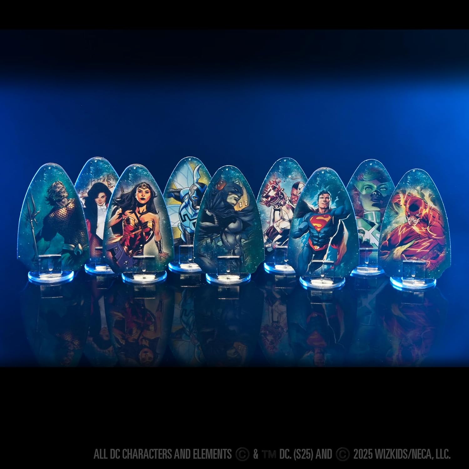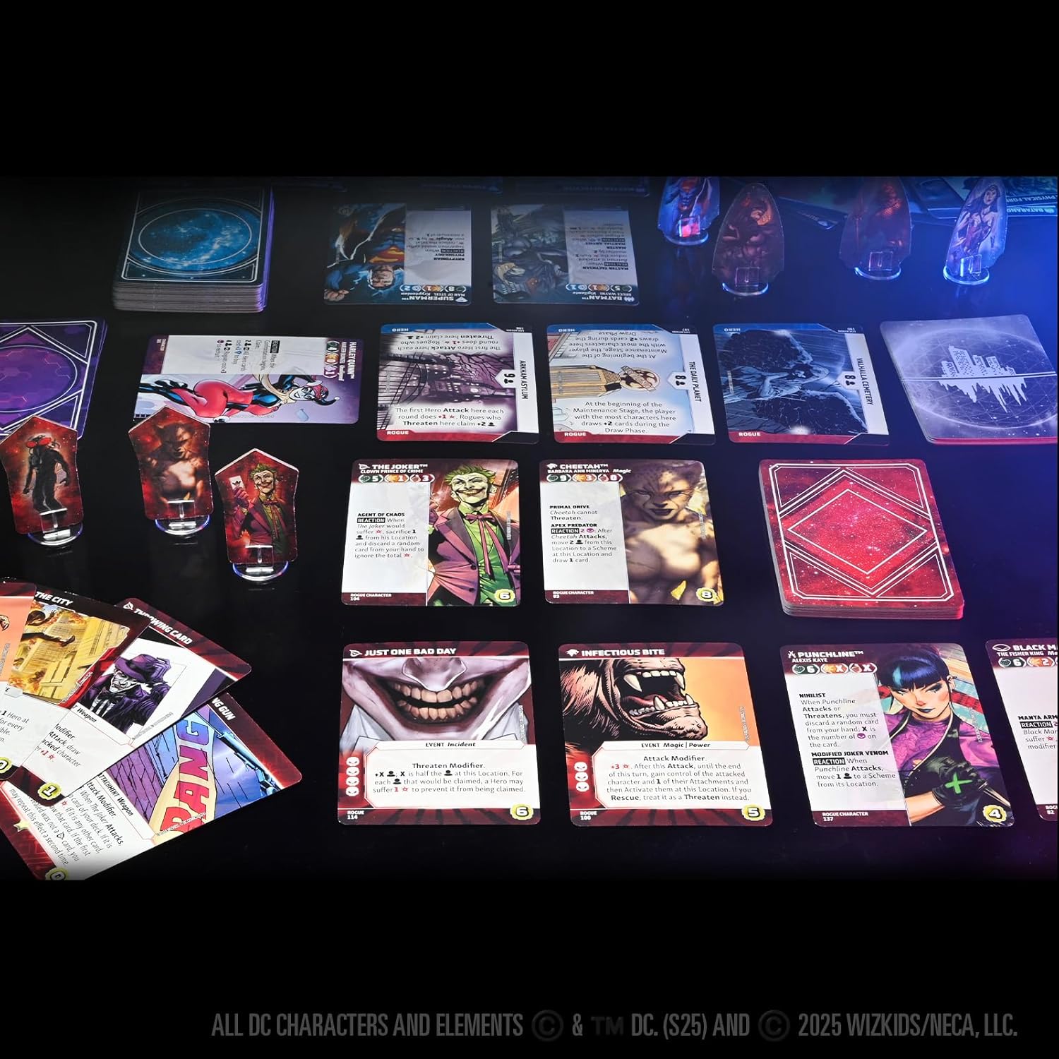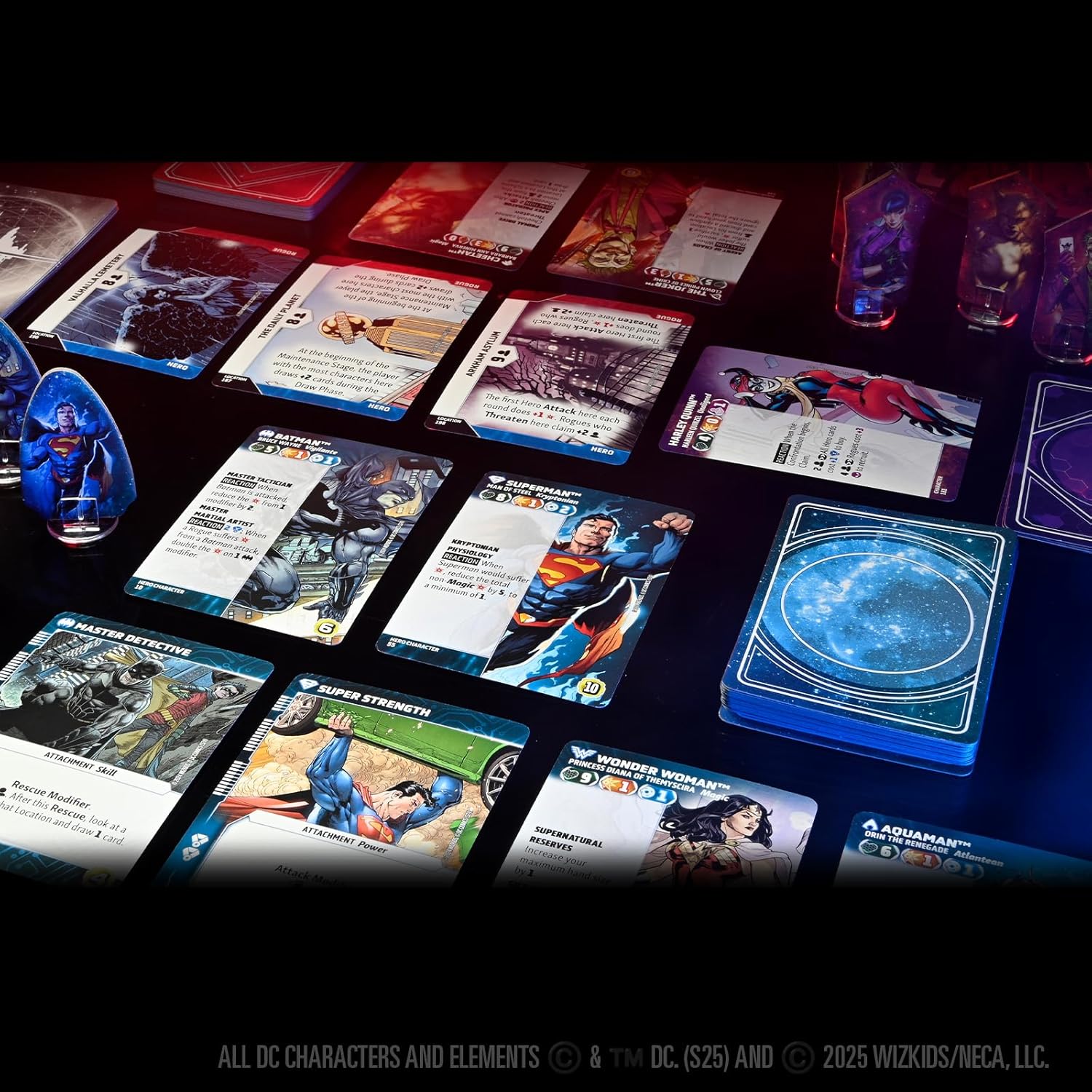 BUILD YOUR TEAM Pick iconic characters pulled from the pages of DC Comicsand form your own squad of heroes or rogues in this action-packed, asymmetrical deck-building game from designer Damon Stone! DEVELOP YOUR POWERS Recruit new characters to your team, each with unique decks and gameplay, and choose which of their cards to addto support your strategy as the game progresses. CHOOSE YOUR STRATEGY Bring the fight to your foes directly or focus on your masterplan as you clash at classic DC Comics locations from theshadowy alleyways of Gotham City to the subaquatic depthsof Atlantis. ENDLESS POSSIBILITIES With multiple pathways to victory, eighteen playablecharacters, and hundreds of cards to choose from, no twogames play out the same way. Let the battle begin! Contains: 80+ Hero Cards 80+ Rogue Cards 12 Location cards 8 Unaligned character cards 25+ Citizen Tokens 35+ Damage Tokens 6 Activation Tokens 18 Character Standees