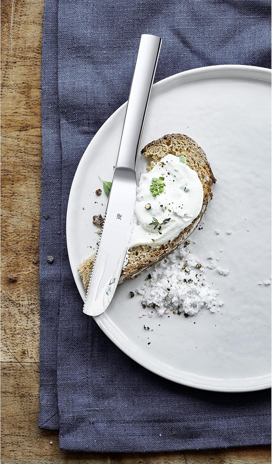 Product Description For the Nova collection, designer jutta keil created special cutlery for delectable moments. From the brunch knife to the cake server to the salad servers – a range of cutlery to suit all occasions and tastes: egg spoons for soft boiled eggs, a lasagne server for hearty pasta bakes, espresso and late macchiato spoons for Italian coffee Specialities. For the tongs in the collection, designer andre stocker created universal and pasta tongs as well as asparagus and perforated serving tongs. The latter can be used for example for picking up Mozzarella and tomatoes – leaving the marinade on the plate. The special cutlery and dimensionally stable tongs are made from polished cromargan and thanks to their sleek, timeless design, go well with all tableware. WMF items of cutlery are available separately or as a set and can be cleaned in the dishwasher. The brunch knife is five centimetres shorter than a dinner knife and therefore looks much smaller. Its serrated blade easily cuts bread rolls in half. The rounded handle sits comfortably in the hand, while the wide blade is good for spreading bread and baked goods. Made from polished cromargan, this special item of cutlery is dimensionally stable, rust-free, resistant to food acids and can be cleaned in the dishwasher. Offers the 19.5-Centimetre-long brunch knife as a 2-piece set in the Nova collection. Thanks to its timeless design, it is just as much at home at the breakfast table as it is at a stylish lunch Set Contains: 2 x brunch knife