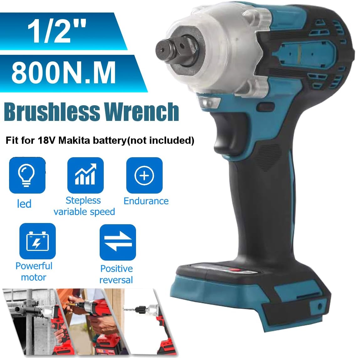 800N.m. Brushless Cordless 1/2'' Impact Wrench Driver Replacement for M 18V BatteryFeatures:800N.M high torque, stepless speed change switch.Powerful electric wrench, multi-purpose, super power.Tungsten steel shaft, high hardness and wear resistance.Suitable for construction site shelves, maintenance, woodworking, etc.The brushless motor does not generate sparks when it is working, and the motor does not wear.Specifications:Name: Cordless Brushless WrenchMode: DTW300Adapted to 18V Makit battery(Batteries are not included)Color: black+blueNo Load Speed: 0 - 4000 rpmImpact frequency: 0 - 4000 ipmMaximum Torque: 800N.MChuck:12.7mm(1/2")
