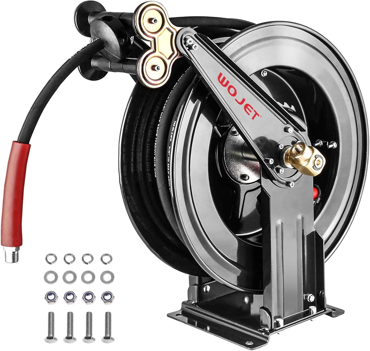 Pressure Washer Hose Reel 50 ft x 3/8 in, Retractable Hose Reel for Water/Air/Oil, Heavy Duty Hose Reel in Steel, Power Washer Hose Reel with Dual Arm, Auto Rewind, Max 4000PSI (Without Hose). WOJET Pressure Washer Quick Connect Kit, M22 14mm Quick Connect Pressure Washer Fittings, M22 to 3/8 Quick Connect, Garden Hose Quick Connect, Pressure Washer Adapter Set, Stainless Steel Hose Adapter