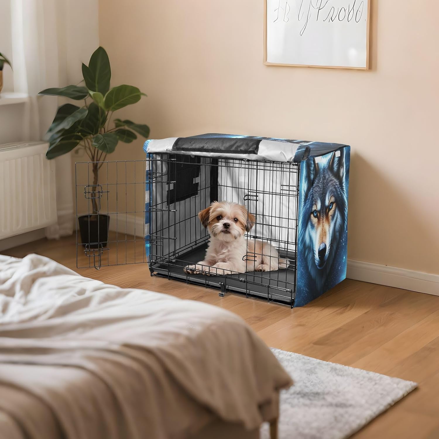 Weather-Resistant and Protective – Made of 600D silver-coated oxford fabric, this dog crate cover offers robust protection from wind, rain, and sunlight, ensuring your pet stays safe and comfortable.Easy and Convenient Installation – This breathable pet cage cover is equipped with an intuitive fastening system, making it easy to install and remove without tools. The secure fit ensures the cover stays in place.Optimal Airflow – Mesh windows on all sides provide excellent ventilation, helping to keep your dog comfortable and cool while offering privacy inside the crate.Wind-Resistant Stability – With four adjustable tie-down straps, this indoor dog crate cover stays securely in place, preventing it from being moved or blown away by wind, ensuring continuous protection.Suitable for Travel and Home – This versatile pet kennel cover is ideal for both indoor and travel use. It provides a practical solution to protect your pet’s crate wherever you are.