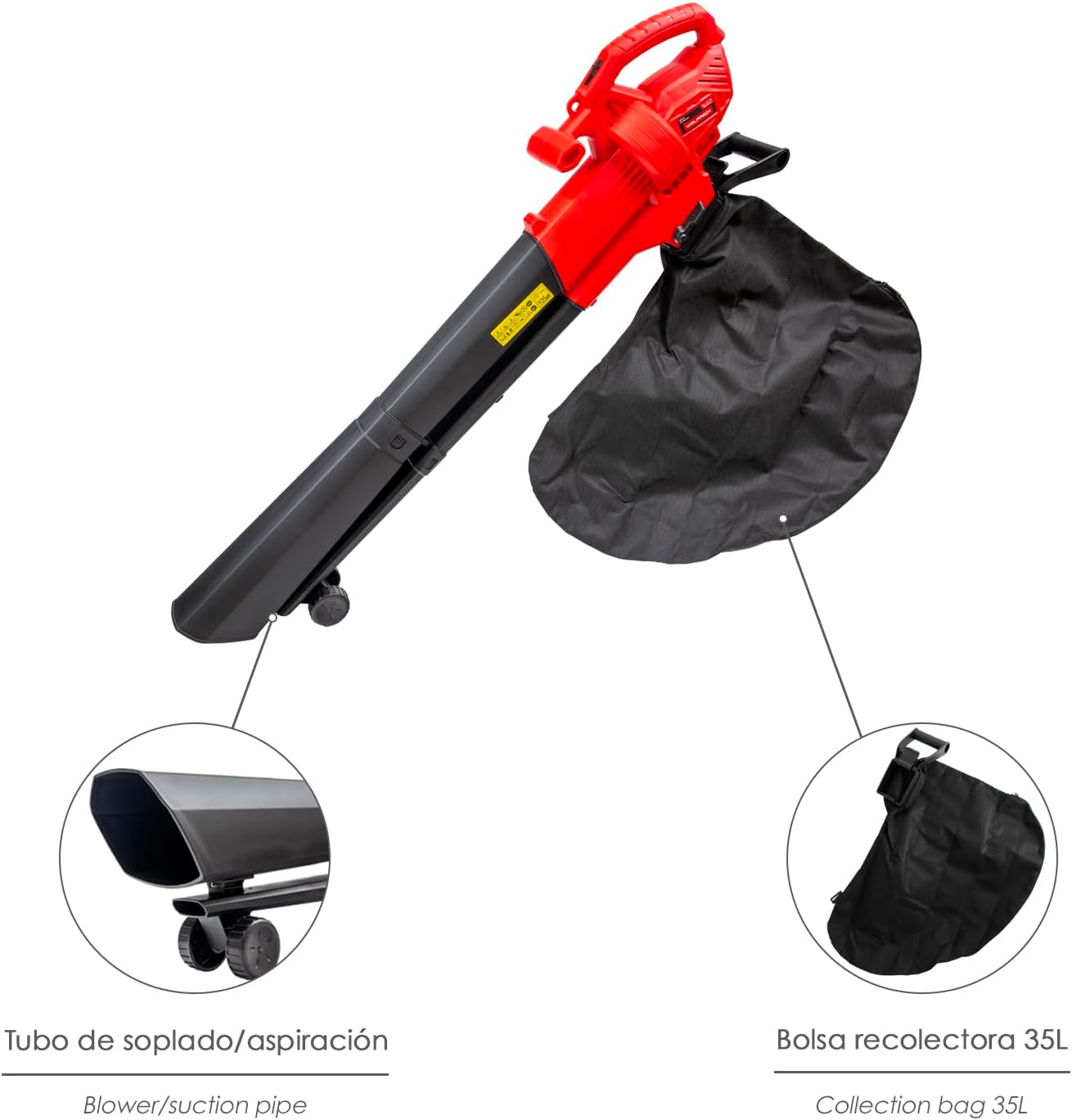 Vacuum Cleaner Leaf Blower for Garden with a power of 3,000 Watts that allows exceptional performance. With a no-load speed of 12,000 to 15,000 R.P.M. and a maximum air volume of 13.2 m3 per minute, ensures effective and quick cleaning. It reaches a maximum air speed of 270 km/h to leave your outdoor spaces spotless. Includes a 35 litre capacity collection bag with zip closure system for easy emptying. In addition, it has 2 guide wheels that provide stability and comfort when travelling. Its triple function of vacuum, blower and shredder makes it a versatile tool for maintaining your garden. The 10:1 crushing ratio significantly reduces the volume of the collected leaves, optimizing the space in the bag. With a cable length of 35 cm, it gives you greater freedom of movement without needing to be near an outlet. With a light weight of 2.3kg, it is easy to handle and carry. Thanks to this vacuum blower, you can keep your gardens and wooded areas free of leaves and dirt efficiently and effortlessly. Make outdoor cleaning a simple and quick task with this powerful tool!