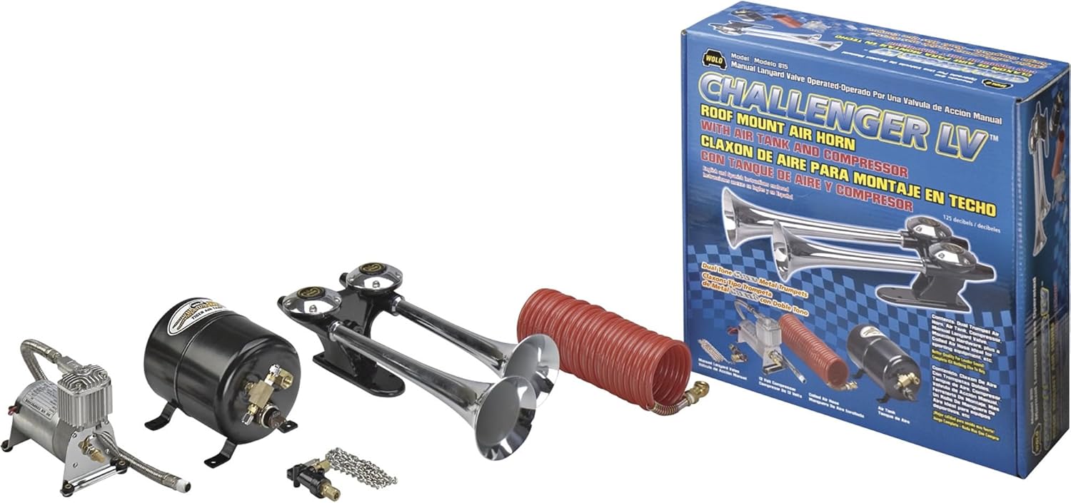 Product Description The Wolo 815 is a high pressure roof mount air horn powered by an on-board air system. Challenger LV produces an ultra-powerful, big rig alerting sound, controlled by a 12-volt heavy-duty manual lanyard valve. The horns’ base is painted black enamel and both trumpets have a bright chrome finish, which will dress up any vehicle big or small. Installation is made easy with Wolo’s new flexible inlet hose, with brass fittings, that is hidden from view. Included is a two piece on-board high pressure air system consisting of a 2-1/2 liter steel air storage tank, with a built-in pressure switch and a heavy-duty high-pressure compressor. All moving parts of the compressor are manufactured to Wolo’s strict standards. The compressor motor is carefully balanced and the mounting bracket has rubber bushings, to virtually eliminate all vibration. A 20 foot coiled air hose with brass fittings is included to inflate shocks, rafts and other applications, note air system is not designed to inflate applications requiring a large volume such as vehicle tires. Included in kit is; wire, horn switch, high-pressure hose, flexible inlet hose, lanyard valve, stainless steel mounting hardware, and a rubber gasket for a watertight installation. Instructions in English / Spanish. From the Manufacturer The Model 810 and the Model 815 offer the same powerful roof mount horn. These models only differ in the way they are activated: Model 810 electric solenoid and Model 815 lanyard. Both models of Challenger come complete with a maintenance free on board air system. Each of the kits include everything that is needed to install on any 12 volt vehicle: a deluxe roof mounted horn that is all metal with triple chrome plated trumpets, heavy duty compressor, tank, hoses, mounting hardware, and instructions. All moving parts of the air compressor are manufactured to precision tolerances. The compressor's motor computer balanced, reducing noise and vibration. The kit also includes 20 feet of plastic hose with air fittings to inflate tires, shocks, rafts or any application requiring air. The trumpets are built on a heavy mounting base that secures to the vehicle using four rust- resistant stainless steel bolts. Either model horn will deliver a powerful sound to be heard. Kit comes with all needed mounting hardware. Spanish instructions included. FEATURESHorn size: L 16 1/2 in. x W 8 in. x H 4 3/4 in. Horn output with 90/100 psi: 125 db Horn construction: All metal, chrome plated trumpets Compressor: 12 volts Compressor current: 10 amperes Tank capacity: 2 1/2 liters Tank pressure: 90/100 psi Challenger EV: Electric solenoid 12 volts / 300 milliamps Challenger LV: Hand pull manual valve