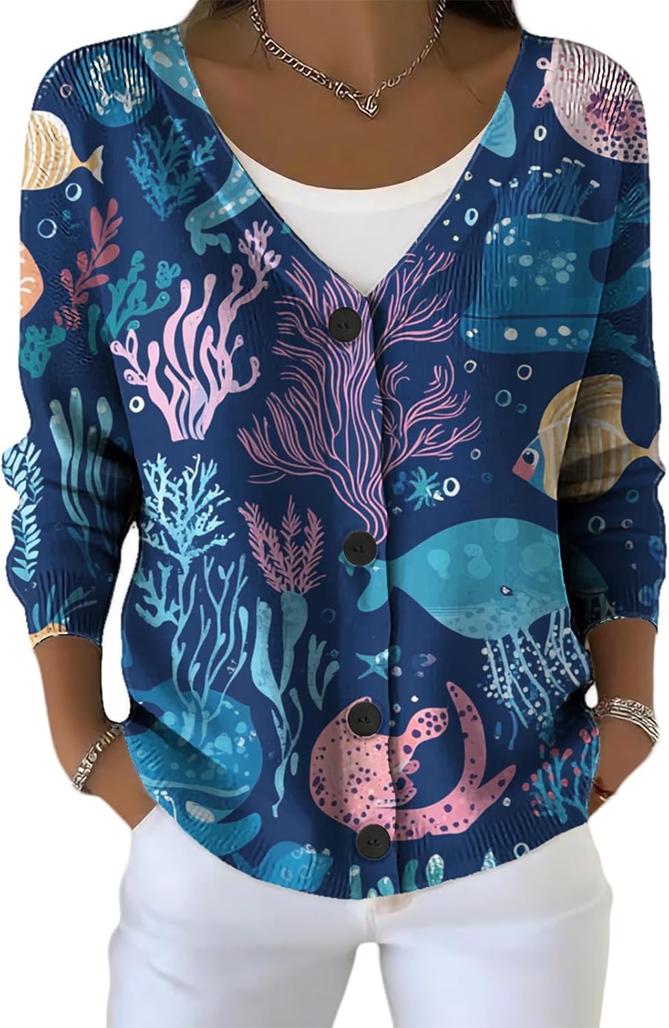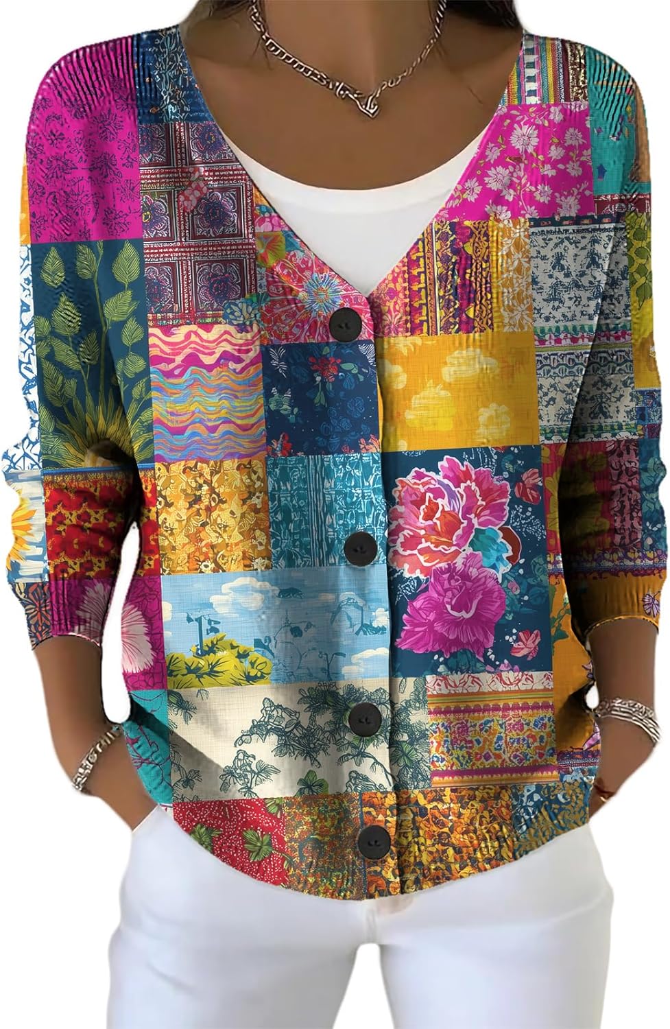 YABTF Women Boho Floral Print Cardigan Sweaters Long Sleeve V Neck Graphic Button up Cardigan Fall Fashion Cable Knit Sweater