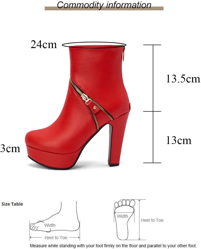 Product descriptionShoes Type: Women's BootsOuter Material: Polyurethane (PU)Inner Material: SyntheticSole: RubberHeel Type: Block HeelClosure: ZipperShoe Width: MediumHeel Height: 5.1 Inches / 13 CMWomen's Fashion Platform Chunky High Heel Chelsea Boots Ankle Booties with ZipperFashion gothic punk boots are suitable for different outfit, such as jeans, skirt, sweater and so on. Wearing the boots,you can catch the eye from the crowd in party, work, travel, concert, cosplay, etcCare Instructions: Clean Away dirt using a damp cloth, allow to dry apply correct coloured wax based shoe polish to restore shine as desired.Service: We strive to offer a wide range of the latest fashion footwear (such as pumps, sandals, Mary Janes, boots & ankle boots, mules, ballerinas, etc.)Suggestion: Had better check the actual measurements(Foot Length) in the size chart on the shoe¡¯s product page and compare them to your foot measurements before ordering.