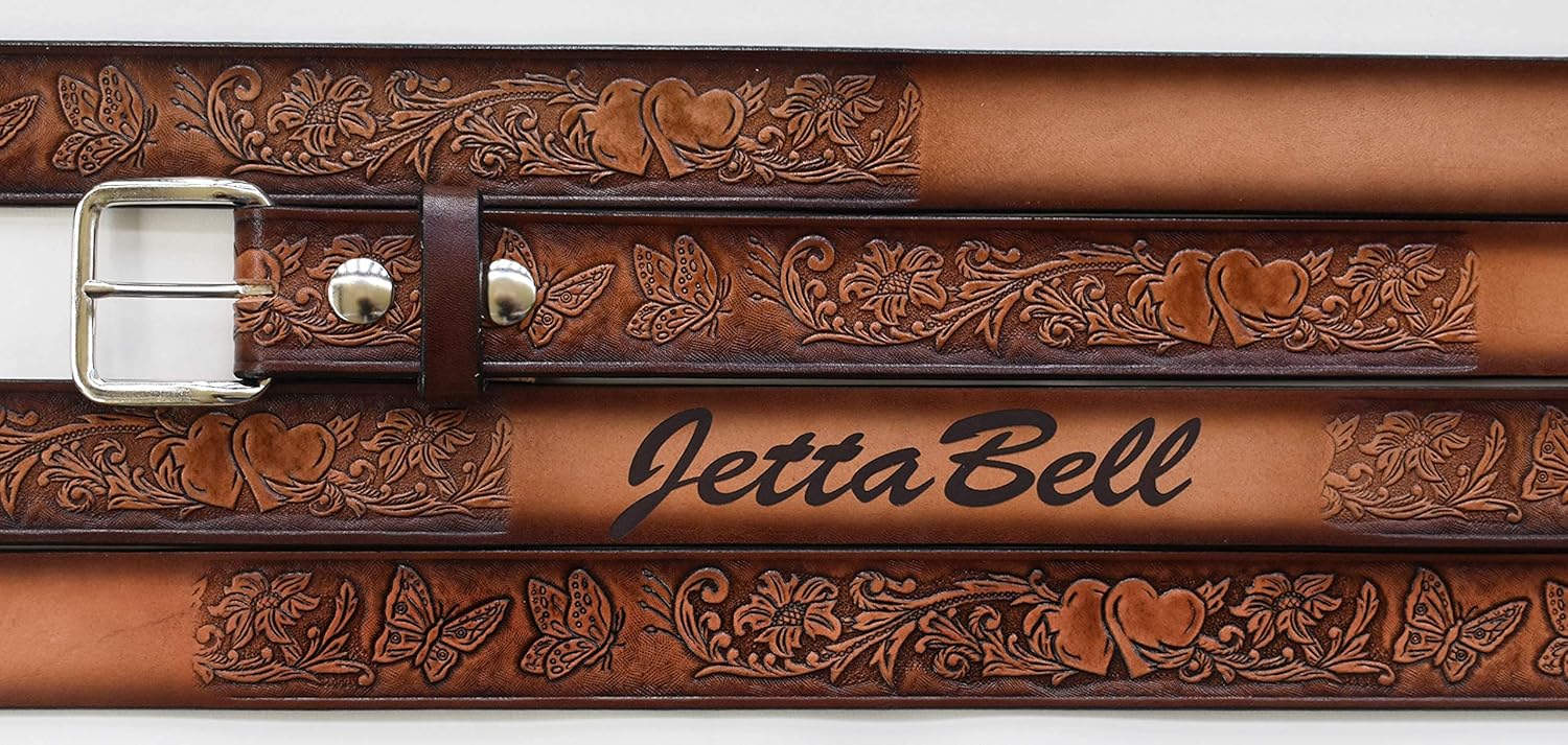 Hearts and Butterflies with flowers leather name belt. This belt is embossed with hearts, butterflies and flowers and includes your name engraved and silver buckle and leather loop. 1 1/2 inch wide leather belts using the thickest 9/10 OZ cowhide (The best you can use for a belt). We hand finish each belt and use a durable lacquer finish on each belt that will last for years! This is one piece of leather, not pieced or composite leather. Please note: We cut each belt when ordered and all belt makers/manufactures use different methods when ordering belts. Please measure carefully, custom name belts are non-refundable. Measuring guide: Using an existing belt, correct measurement begins from the place where the buckle connects to the belt (do not include buckle) and then to the middle hole. We put 7 holes in belt and the center hole is the length you are ordering. FOR GIRLS: See guide for help