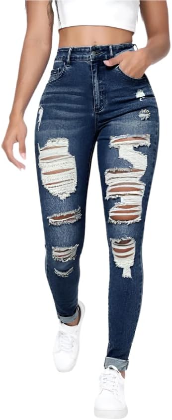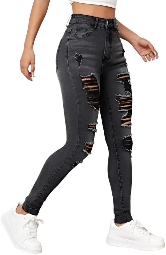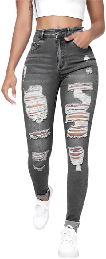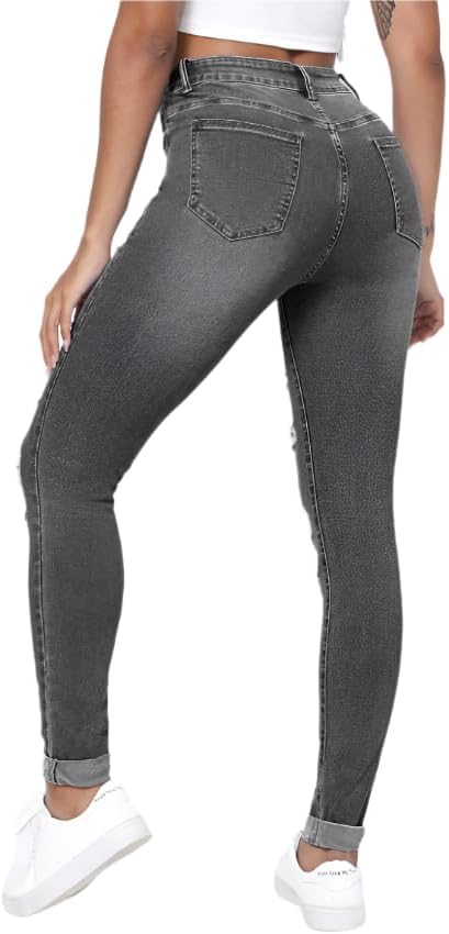 These women's distressed skinny denim jeans combine classic style with a modern twist, offering an ideal choice for casual wear. Designed with a natural waistline and a flattering skinny fit, they feature stylish ripped accents and functional pockets for both utility and fashion. Available in versatile colors like grey, dark grey, dusty blue, dark wash, and medium wash, these jeans suit a variety of outfits and occasions. Made from durable denim, they provide long-lasting comfort while being easy to care for with machine wash instructions. With a timeless zipper fly and button closure, these jeans deliver effortless style and practicality.