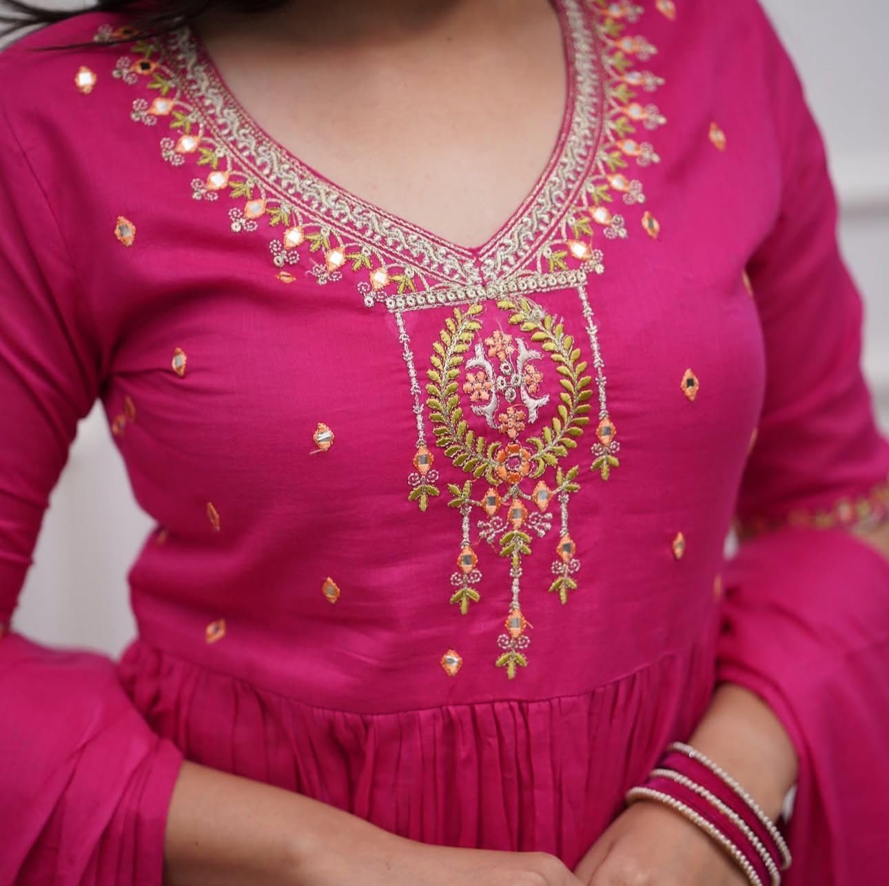 The Sambhav Quilt Hub Vibrant Pink Gota Work Cotton Mulmul Sharara Set is a stunning ethnic ensemble that combines elegance, comfort, and traditional craftsmanship. Made from soft and breathable cotton mulmul fabric, this set ensures all-day comfort and ease of movement, making it perfect for festive occasions, weddings, and cultural celebrations. The short flair kurti is adorned with intricate gota work and embroidery on the neck and sleeves, adding a touch of sophistication and charm to the outfit. Paired with a beautifully designed sharara and a detailed embroidered dupatta, this set creates a cohesive and graceful look that is ideal for any special event. The vibrant pink color enhances its appeal, making it a standout choice for women seeking stylish ethnic wear. Designed to flatter all body types, the lightweight construction ensures practicality and comfort for extended wear. Easy to maintain and versatile, this sharara set is perfect for accessorizing to elevate the ensemble for grand celebrations or wearing as-is for a refined yet understated look. Whether styled traditionally or with a modern twist, this outfit embodies timeless beauty and functionality, making it an essential addition to your wardrobe.