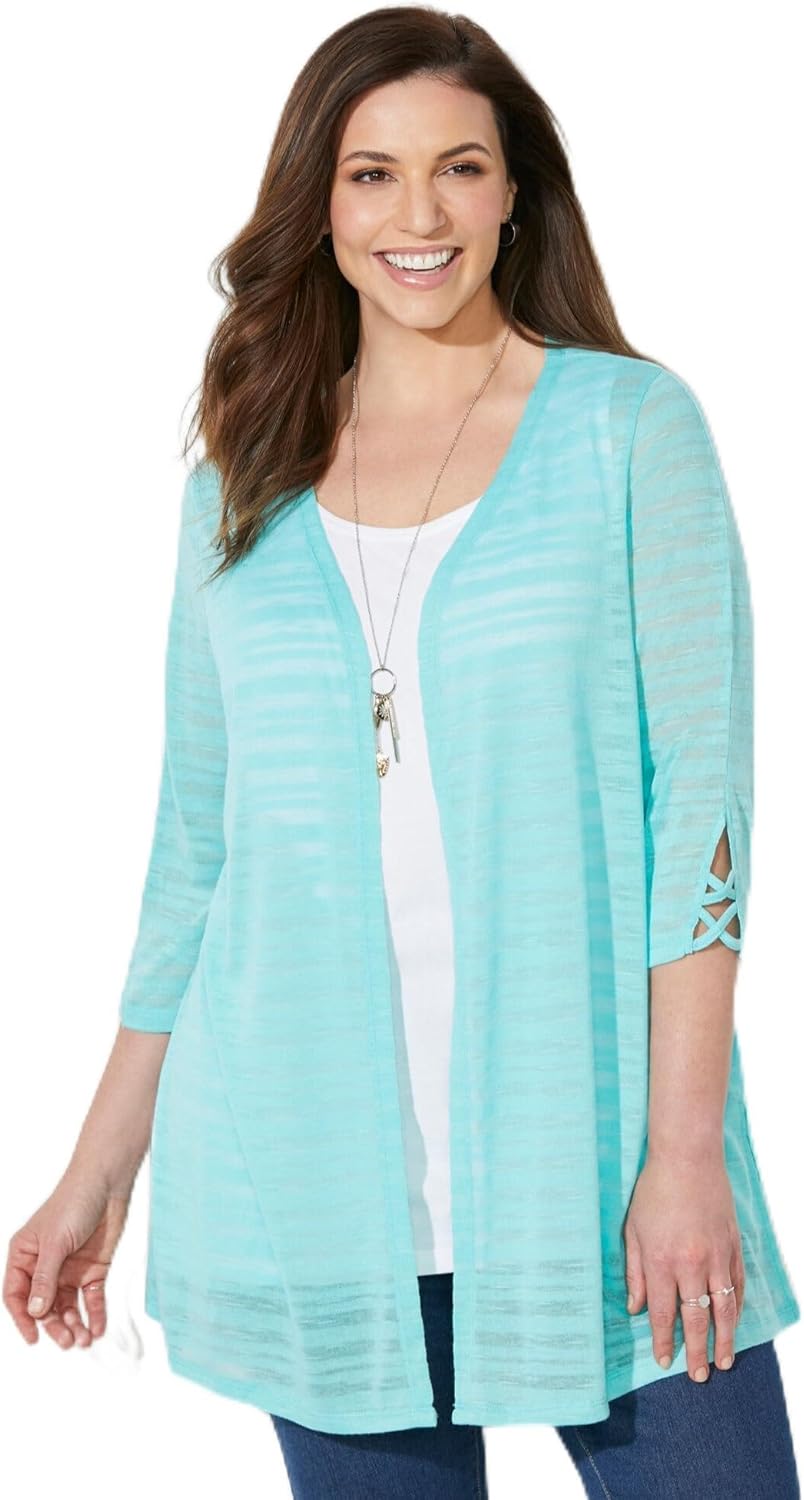 The subtle shadowy stripes and bold hue of this open-front cardigan make it an effortlessly beautiful top layer for a little extra warmth on breezy days.FABRIC: Light and airy sweater knit with a unique textured stripe pattern.FIT: Relaxed, flowing silhouette. Open front. 3/4 sleeves with crisscross detail at cuffs. Side slits at hem. 70% Polyester/30% Rayonbr>Machine washbr>Importedbr>Regular: 31” lengthbr>Petite Short: 27.5" lengthbr>Petite: 29” lengthbr>Plus Sizes 0X-6X, Petite Short Plus Sizes 0XWPS-3XWPS, Petite Plus Sizes 0XWP-3XWPbr>Catherines