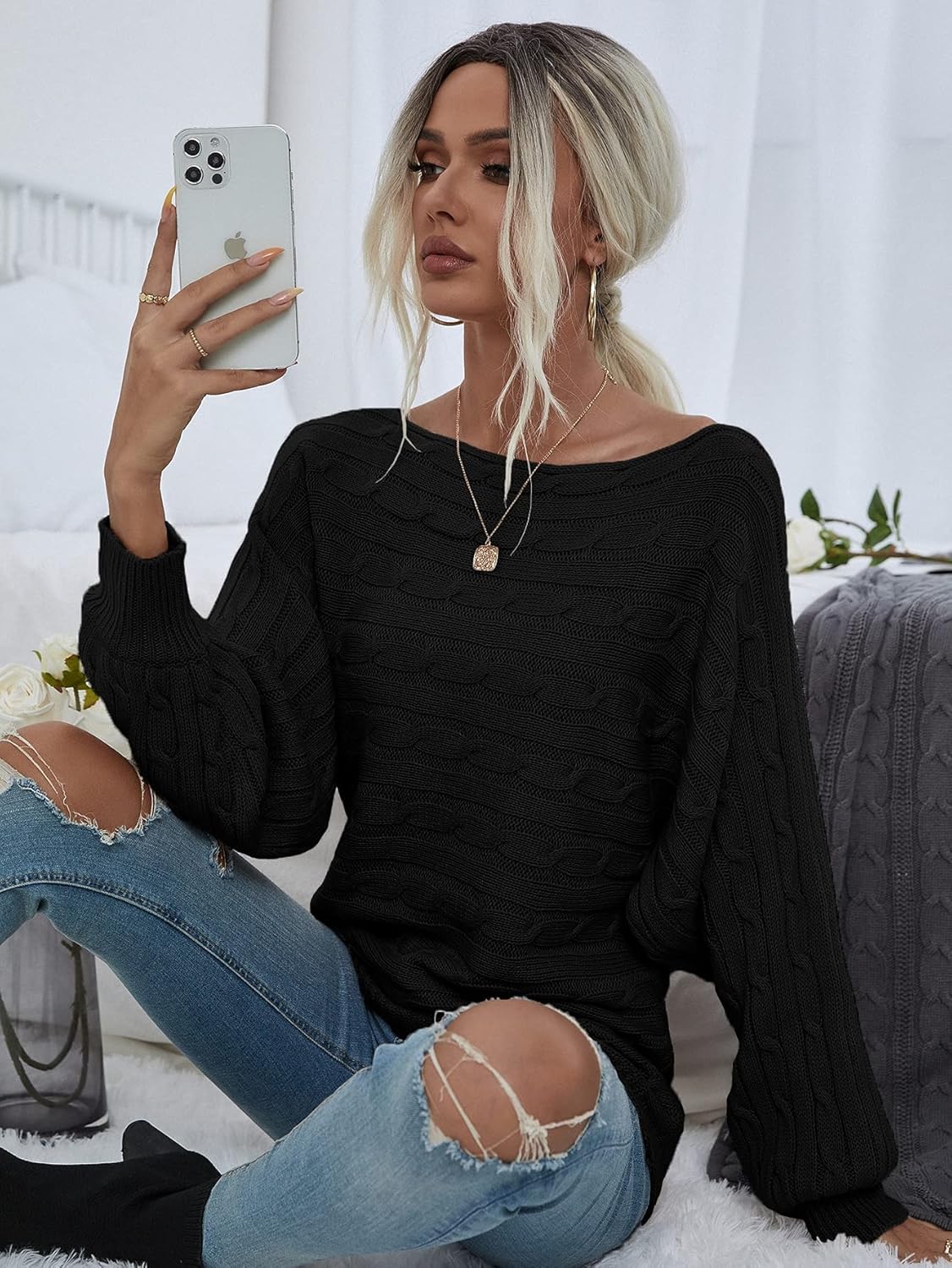 SBust : 37.8 inchLength : 23.6 inchSleeve Length : 25.6 inchMBust : 39.4 inchLength : 24 inchSleeve Length : 26.1 inchLBust : 41.7 inchLength : 24.6 inchSleeve Length : 26.7 inchColor: Apricot,Beige,BlackStyle: CasualPattern Type: PlainType: PulloversNeckline: Boat NeckSleeve Length: Long SleeveSleeve Type: Batwing SleeveLength: RegularFit Type: Regular FitFabric: Medium StretchMaterial: AcrylicComposition: 100% AcrylicCare Instructions: Machine wash or professional dry cleanSheer: No