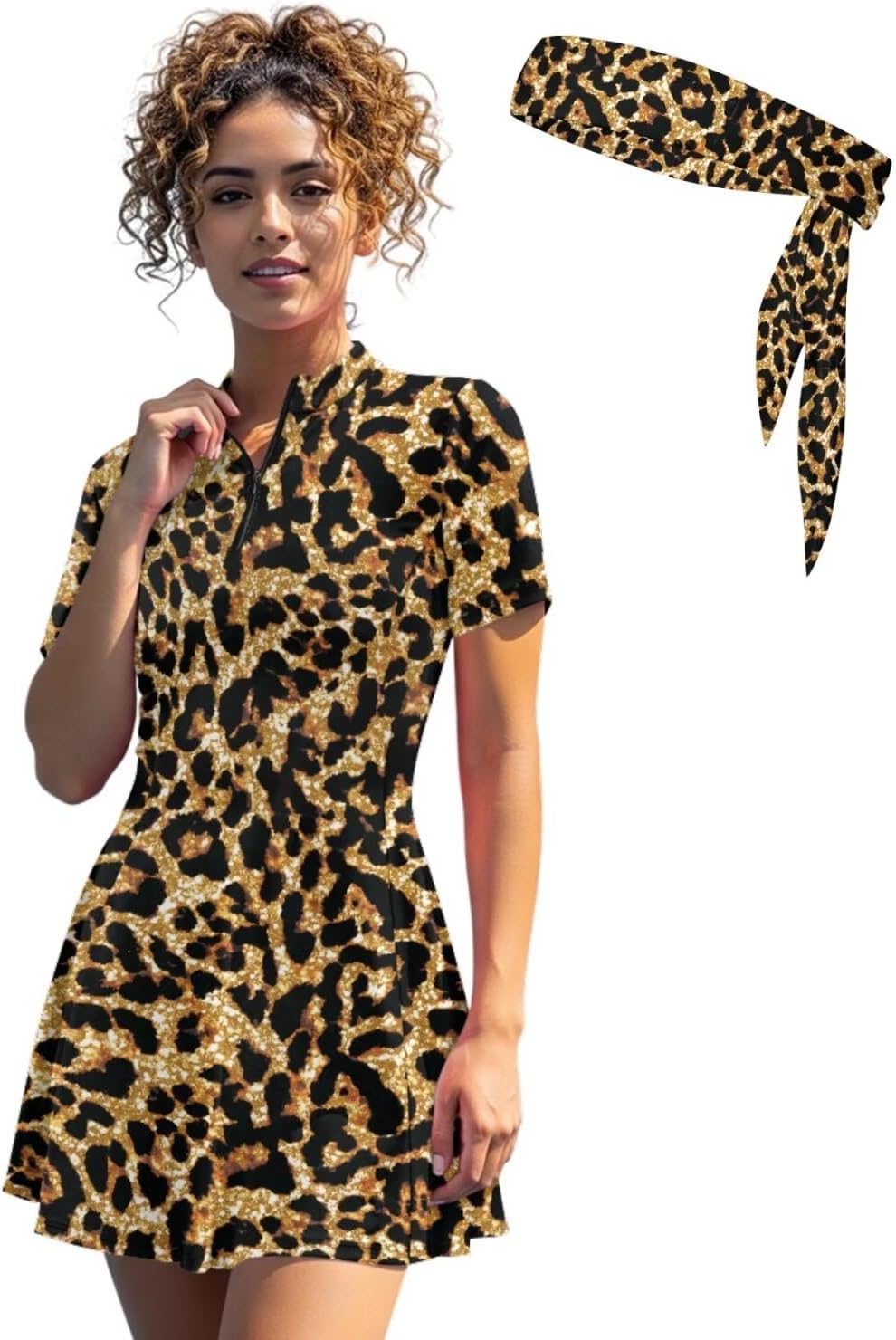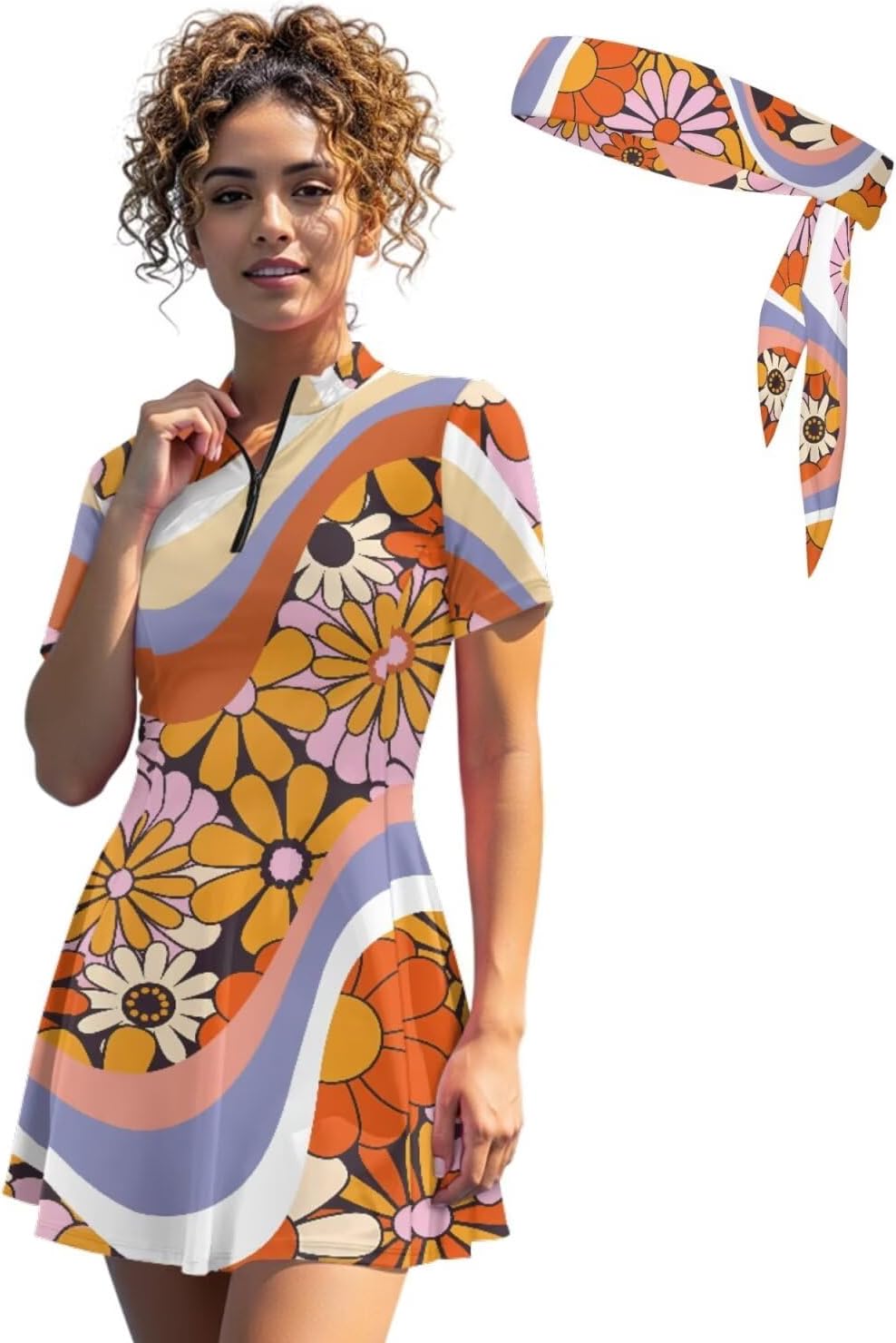 Suhoaziia's Womens Zip Front Tennis Dress V-Neck Short Sleeve Athletic Workout Dresses with Tennis Sweatbands 3 Pieces Pickleball Golf Outfits Build in Shorts with Pockets About Size (Inch): XS - Dress Length: 31.1''; Bust: 32.28''; Waist: 27.56''; Shorts Length: 12.6'' S - Dress Length: 31.89''; Bust: 33.86''; Waist: 29.13''; Shorts Length: 12.99'' M - Dress Length: 32.68''; Bust: 36.22''; Waist: 31.49''; Shorts Length: 13.39'' L - Dress Length: 33.46''; Bust: 38.58''; Waist: 33.86''; Shorts Length: 13.78'' XL - Dress Length: 34.25''; Bust: 41.73''; Waist: 37.01''; Shorts Length: 14.17'' 2XL - Dress Length: 35.04''; Bust: 44.88''; Waist: 40.16''; Shorts Length: 14.57'' Features: Slim fit, short sleeve, ruffle hem, functional zip-neck collar, short length Novelty Prints: Stylish pattern brings you a new experience, we have a variety of fun print for you to choose from, such as dog paws, hippie flowers, cow print, zebra stripes, sunflower, etc. If you want something different, try our casual sports dresses! Ideal Gifts: Great gift option for yourself, girlfriend, wife, mother, sister, daughter or friends on Birthday, Halloween, Thanksgiving, Christmas, Summer Vacation or Golf Games. Easy to care, suitable for all seasons.
