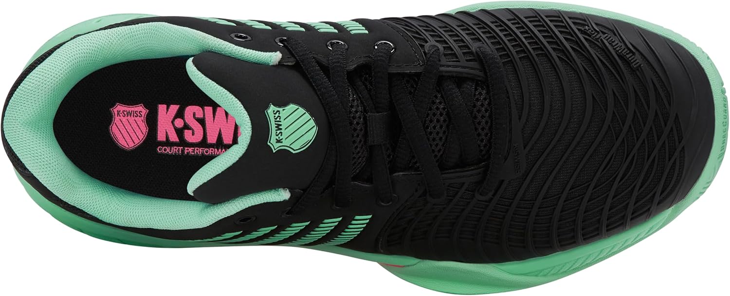 The Express Light 3 is a lightweight tennis shoe designed for performance on the court and a high level of comfort. As an updated model of its successful predecessor, the upper features DuraWrap Flex, a newly designed molded RPU cage that provides flexible support and protection from draughts. On the inside, a well-padded ankle collar provides comfort and stability, while a die-cut foam insert provides responsive underfoot cushioning. The outsole of the Express Light 3 is made from K-Swiss's signature Aösta 7.0 high density rubber and a deep herringbone tread specially designed for unmatched durability and performance on all courts.