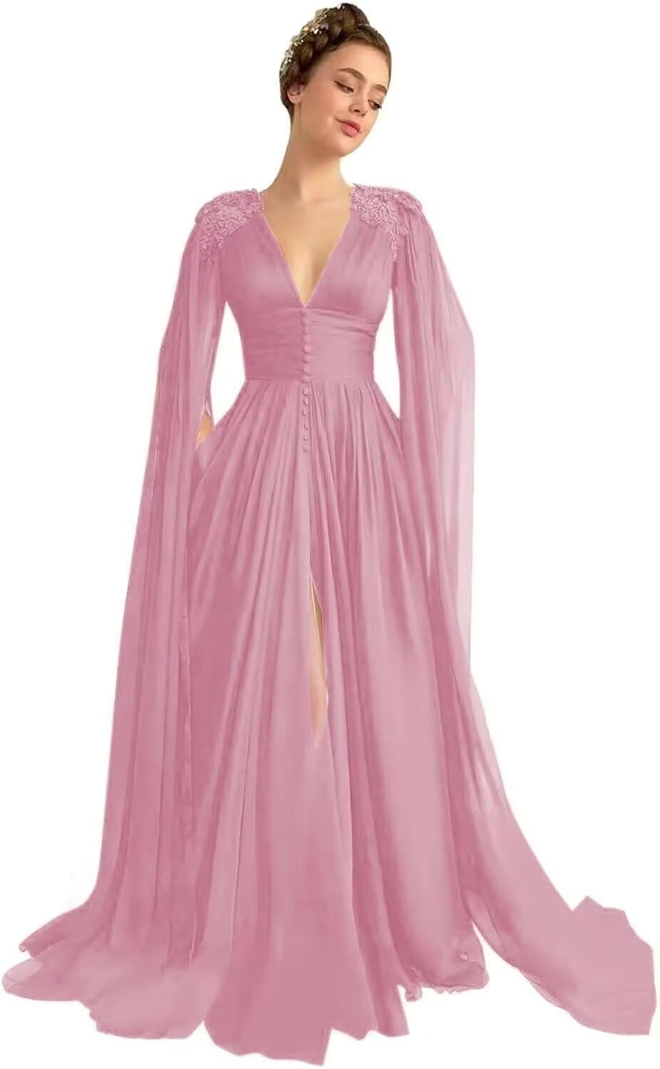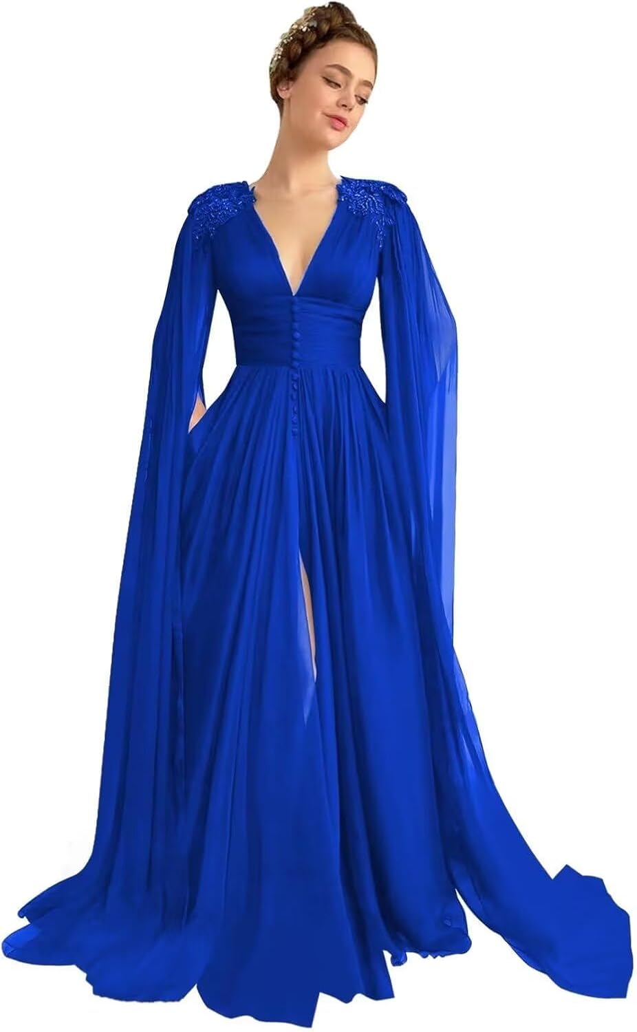| Fabric Type | Tulle Prom Dress with Cape V Neck Lace Applique Prom Dresses Long Slit Ball Gown for Women |